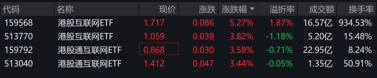 每经记者 叶峰 每经编辑 肖芮冬 港股全天震荡走高,港股互联网ETF大涨逾5%,创上市新高,截至发稿,换手率超900%。 港股互联网ETF跟踪中证港股通互联网指数,该指数从港股通范围内选取30家涉及互 ...