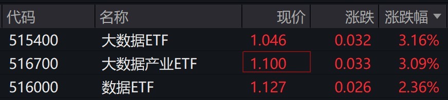 每经记者 叶峰 每经编辑 肖芮冬 大数据概念股走高,浪潮信息涨超7%,润泽科技、宝信软件涨超6%,中科曙光、紫光股份涨超3%。 受盘面影响,跟踪中证大数据产业指数的ETF涨约3%。 有券商表示,AI等 ...