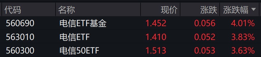 每经记者 叶峰 每经编辑 肖芮冬 通信概念股走高,新易盛涨超13%,中际旭创涨超9%,中国联通涨超6%,中国电信、紫光股份涨超4%。 受重仓股上涨影响,跟踪中证电信主题指数的ETF涨约4%。 中证电信 ...