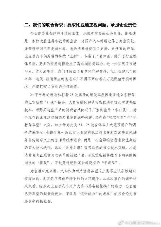 同辰科技讯 2月17日下午消息,一则《比亚迪(002594)汽车 24、25 款车型全体车主联合维权声明》流出。内容显示,鉴于比亚迪股份有限公司(简称“比亚迪”)在宣传及销售过程中“知新卖旧”、老车主的购车权益受到损害等诸多问题,购买了比亚迪24、25新款王朝、海洋系列全系车型的全体车主今日发布联合发表维权声明。 声明提到,比亚迪汽车涉嫌隐瞒产品迭代计划、未明确区分产品代际,构成误导性销售。其中,2025年2月10日,比亚迪发布消费者短期内已购的同款车型升级版本,新增“天神之眼”智能驾驶系统、中控屏幕升级等核心配置,售价与原款持平。比亚迪在明知新款智驾车型即将上市的情况下,未向消费者披露产品迭代计划,仍以新款车型增配后的原价大量销售配置落后的库存老款车型,剥夺了消费者对商品和服务的知情权与选择权,且新款与老款“同款车型名称、售价相同但核心配置差异显著”,构成未明确区分产品代际,违反《广告法》第八条:商品信息应真实、准确的要求。 声明表示,比亚迪的这一商业行为直接导致大量车主在不知情的情况下以高配的智驾版车型价格购入技术落后、配置降级的普通款车型,构成对消费者的误导性销售。比亚迪对老车主权益的漠视严重损害了消费者的信任和利益。 此次改款与车主购车时间间隔不足六个月,导致老款车辆市场残值大幅缩水,且无法通过官方渠道升级至新配置。对车主二次出售造成不利影响。当前市场反馈显示,同型号非智驾版二手车估值较上月下降18%-25%(数据来源:中国汽车流通协会);比亚迪用“全民智驾”的宣传口号将智驾版定位为“划时代技术迭代”,间接承认旧款。 “购买比亚迪汽车的用户,绝大家庭都是普通工薪家庭,短短6个月不到,自己的爱车价值便损失几万元,并在几年内无缘全民智驾,这种极大的损失感和被淘汰的遗弃感,对用真金白银支持比亚迪发展上半场电动化的老车主们尤为强烈。”比亚迪车主要求比亚迪汽车于7个自然日内向全体老车主公开致歉,同时建立产品迭代信息披露机制,未来需在研发阶段提前6个月公示新款车型的配置变更、价格调整范围及上市意向。” 此外还要求实行老车主权益补偿,对2024年6月至新款车型发布期间购车的车主,提供智驾版车型新车指导价15%置换补贴,以弥补老车主因配置差异导致的损失;同时免费为老款车型提供关键智驾功能(如辅助驾驶系统)的硬件升级服务,或提供与代际差额等价的售后服务权益。 对此,同辰科技向比亚迪汽车方面求证截止发稿公司暂无回应。(文猛) (责任编辑:宋政 HN002)