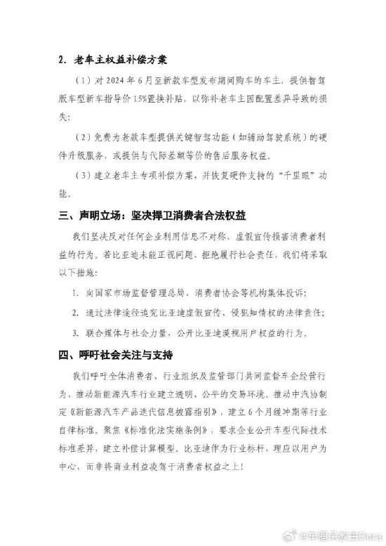 比亚迪24、25款车型车主发起维权声明,指责比亚迪隐瞒产品迭代计划,误导性销售。比亚迪发布新车型并未告知消费者,导致购车后价值下降,影响了消费者利益。车主要求比亚迪公开致歉,建立信息披露机制,并对老车主进 ...