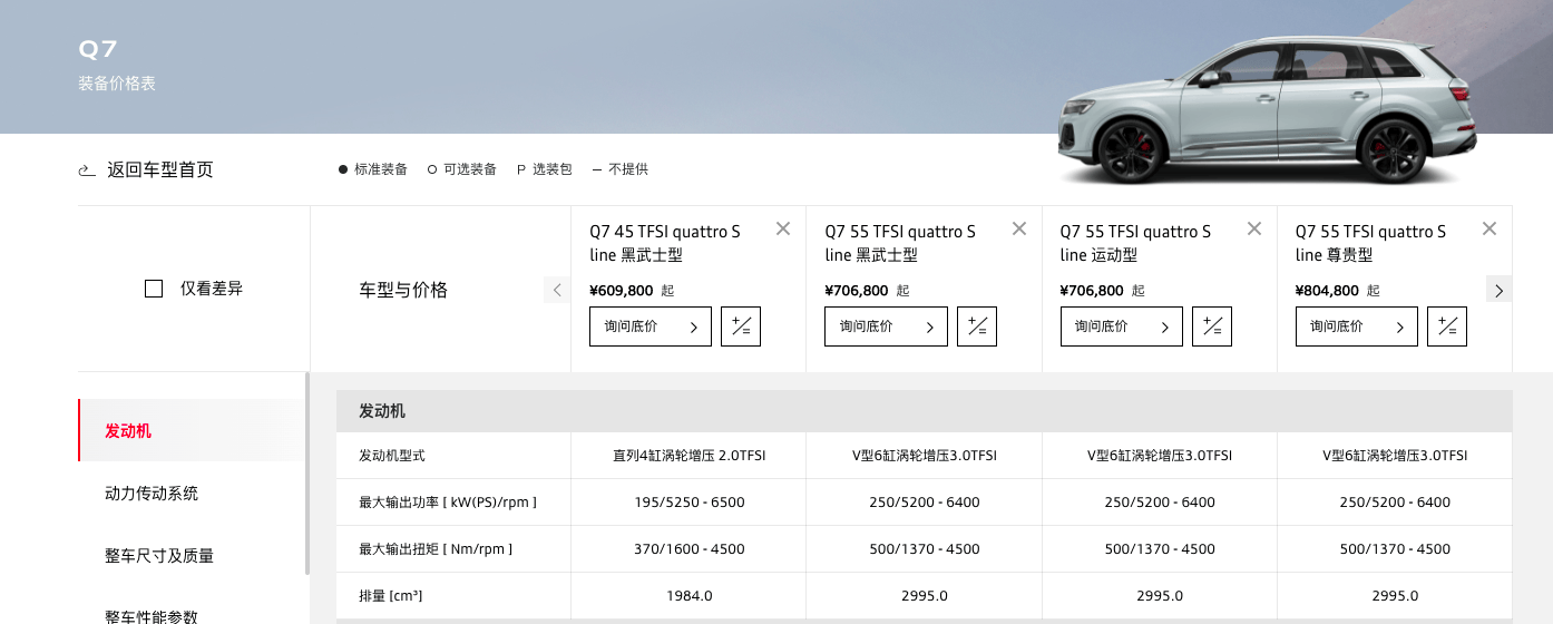 以“一口价”为核心的促销策略,正成为各大车企争夺市场份额的利器。 “目前奥迪Q7全系车型直享一口价政策,其中45 TFSI quattro Sline黑武士版售价低至45.99万元。”上海某一汽奥迪经销商告诉《每日经济新闻》记者。 同样,北京某一汽奥迪经销商也向记者透露:“北京地区奥迪Q7全系车型(售价)都有17万左右的降幅,其中55 TFSI quattro Sline运动版裸车价为53万元。” 一汽奥迪官网显示,奥迪Q7共有45 TFSI quattro Sline黑武士版、55 TFSI quattro Sline黑武士版、55 TFSI quattro Sline运动型、55 TFSI quattro Sline尊贵型四款车型,售价区间在60.98万~80.48万元。 图片来源:一汽奥迪官网 但据记者从多家一汽奥迪经销商处了解到,购车者若要享受高达17万元的优惠,必须贷款购车。“如果全款购买45 TFSI quattro Sline黑武士版,裸车价在51万元。除非贷款购车,才能走45万元的价格。”上述北京某一汽奥迪经销商方面表示。 “只有贷款购车才能享受‘一口价’,全款购车价格要比贷款高出13%左右。”上海某一汽奥迪经销商称,“目前自己所在的店内针对奥迪Q7车型推出了比较优惠的金融政策,可以最长贷款5年。” 记者了解到,当前市场上在售的奥迪Q7车型并非全系都有现车。上述上海某一汽奥迪经销商方面表示:“由于奥迪Q7是进口车,我们店只有55 TFSI quattro Sline运动型,其他车型暂时没有。”北京某一汽奥迪经销商也表示:“我所在的店内只有45 TFSI quattro Sline黑武士版有现车。” 上述上海某一汽奥迪经销商告诉记者:“此次奥迪Q7起售价低至45万元的‘一口价’政策是由厂家推出。”对此,记者向一汽奥迪官方进行求证,但截至发稿未收到对方有效回复。 实际上,从去年开始已经有包括上汽通用等汽车品牌推出“一口价”政策。今年以来,推行“一口价”政策的汽车品牌越来越多。比如,北京现代对旗下第十一代索纳塔、全新途胜L等多款车型实施了“一口价”活动,降价幅度最高达到4.2万元。广汽丰田也针对锋兰达和威兰达两款主力SUV推出了“一口价”活动,其中锋兰达起售价跌破10万元。 从当前来看,积极推行“一口价”模式的多为合资品牌。有分析认为,随着越来越多的“一口价”车型出现,合资品牌需要考虑如何在透明定价的同时,提供更具吸引力的产品和服务。 每日经济新闻 (责任编辑:郭健东 )