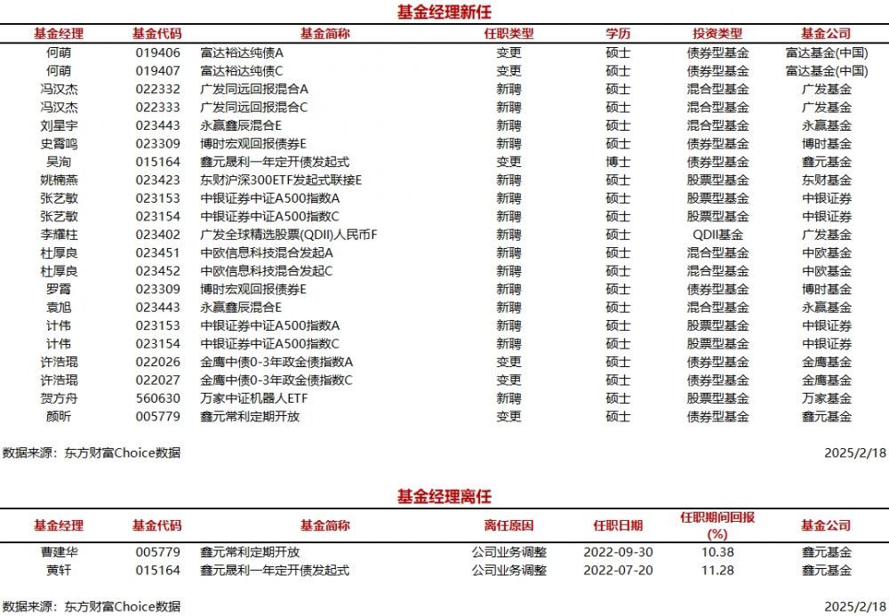 每经AI快讯,据东方财富Choice数据统计,今日新聘基金经理15人,涉及17只基金(A/C类分开计算),主要来自中银证券、广发基金等公司。另外,今日有2位基金经理离任。 ...