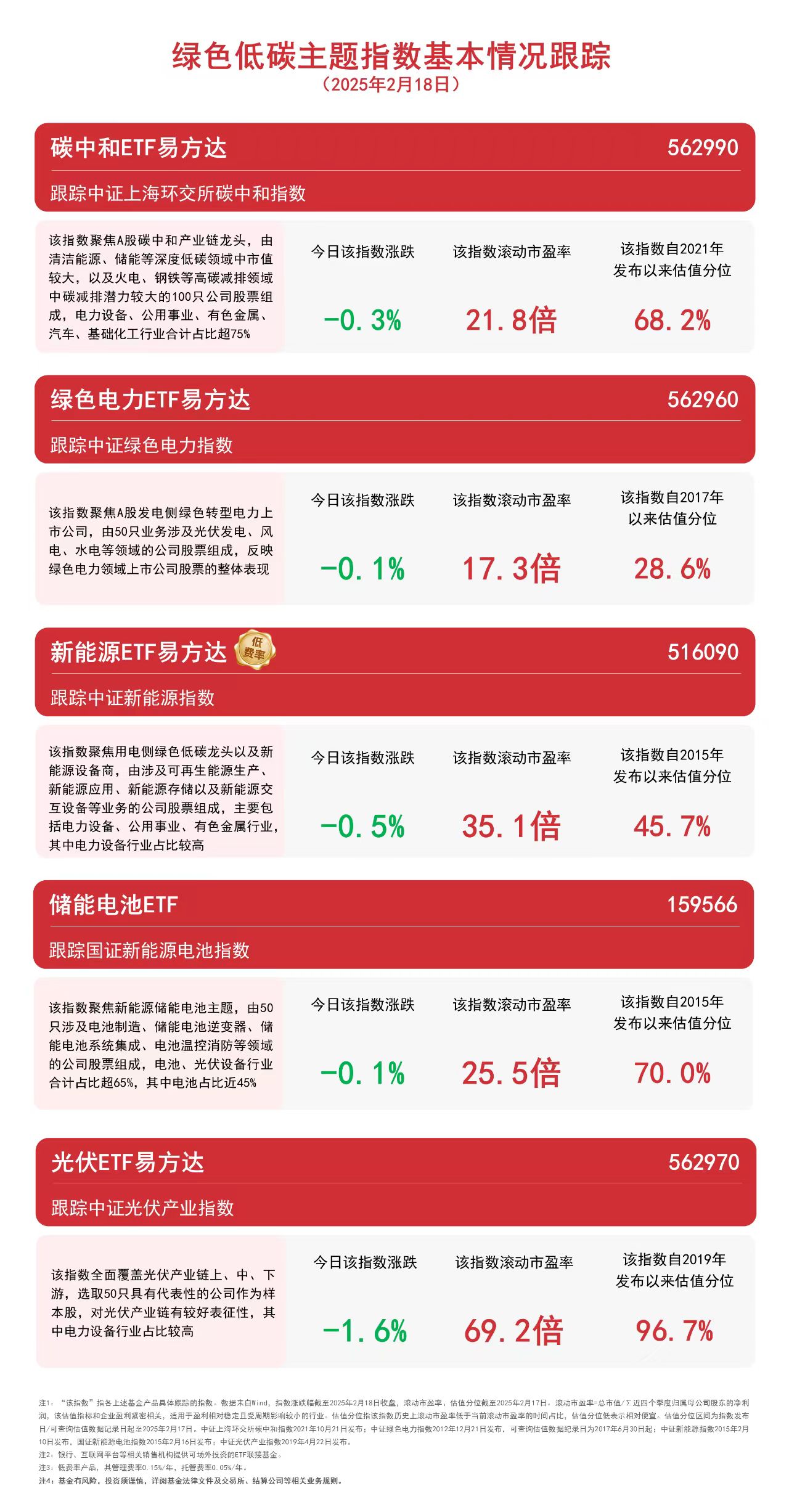 电池、光伏等板块今日冲高回落,截至收盘,中证绿色电力指数、国证新能源电池指数均下跌0.1%,中证上海环交所碳中和指数下跌0.3%,中证新能源指数下跌0.5%,中证光伏产业指数下跌1.6%。 今日,易方达基金旗下8只ETF正式变更简称。其中,易方达中证绿色电力ETF(562960)的简称变更为“绿色电力ETF易方达”,更改后的简称在末尾加上了管理人名称,辨识度更高,便于投资者进行搜索和筛选。 |
