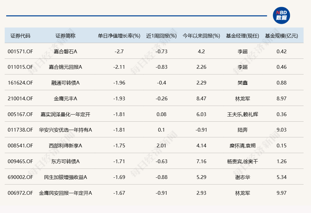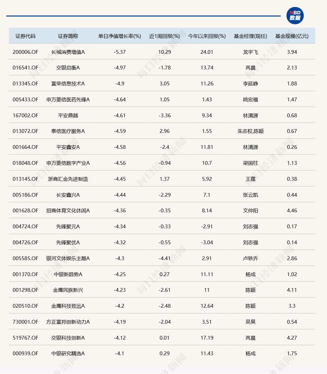 每经记者 赵云 每经编辑 肖芮冬 2月18日,市场午后持续走低,创业板指领跌。板块方面,电池、银行、贵金属等板块涨幅居前,Sora概念、教育、传媒、DeepSeek等板块跌幅居前。全市场超4600只个股下跌。沪深两市全天成交额1.8万亿元,较上个交易日缩量1424亿元。 下面一起来看今天公募基金的表现。 (注:榜单1、2仅选取灵活配置型、偏股混合型和普通股票型三类产品作为主动基金的代表,纳入统计;债基相关榜单包括各类主、被动债券型基金) 1.单日涨幅榜 2.单日跌幅榜 3.单日债基涨跌幅榜 4.晚间值得关注的消息 【潘功胜:中国政府将实施更加积极的财政政策和适度宽松的货币政策 强化宏观经济政策的逆周期调节】 中国人民银行行长潘功胜16日应邀出席由国际货币基金组织与沙特联合主办的新兴市场经济体研讨会,并作主旨发言。潘功胜指出,2024年,中国经济持续回升向好,实现了全年5%的经济增长目标。特别是去年9月下旬以来,中国政府推出了一揽子增量政策,有效提振社会信心,经济明显回升。下一步,中国政府将实施更加积极的财政政策和适度宽松的货币政策,强化宏观经济政策的逆周期调节,持续推动中国经济增长模式转型,巩固和增强经济回升向好势头。 |