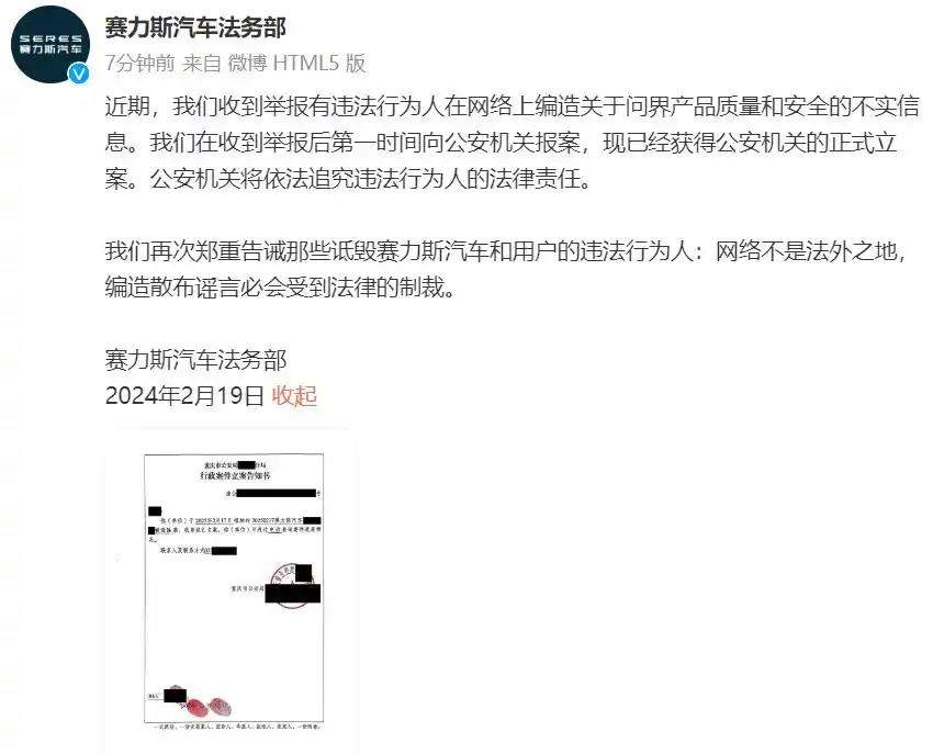 0格隆汇2月19日|赛力斯汽车法务部发文:近期,我们收到举报有违法行为人在网络上编造关于问界产品质量和安全的不实信息。我们在收到举报后第一时间向公安机关报案,现已 ...