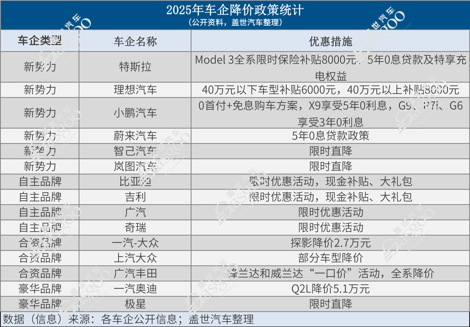 在过去的几年里,汽车市场的竞争似乎被价格战主导。然而,2025年开年,这一局面悄然改变。 2月10日,比亚迪(002594)发布“天神之眼”高阶智驾系统,公开宣布将智能驾驶技术普及至更多价格区间。这似乎标志着,全新的“智驾战”将全面开启,也预示着汽车行业竞争格局的重大转变。 图片来源:比亚迪 数据显示,2024年比亚迪高速NOA渗透率仅为1%,但到2025年,其计划在15万元以下车型全面搭载自研智驾系统。比亚迪制定这一策略的底层逻辑不难理解,利用制造端的规模优势,对冲智驾的高成本,实现技术平权。 数据背后,一个更深刻的转折正在酝酿,汽车产业将要加速从“电动化”迈向“智能化”,而智能驾驶正是这场变革的战略制高点。正如比亚迪董事长王传福预测,“未来2到3年,智驾将成为像安全带一样的标配。”智驾能力将成为汽车行业“决战”前夜最锋利的武器之一。 或许,车企们已经开始意识到,单纯的价格竞争无法满足消费者对汽车智能化、科技化的需求。从价格战到智驾战的转变,不仅是车企战略的调整,更是行业发展的必然趋势。 这场变革的最终结果,或许将重塑未来十年全球汽车产业的格局与话语权。 2025,车市价格战转向智驾战 如果要为这两年中国车市锚定一个关键词,“价格战”或许会是大多数人的选择。 谁是挑起价格战主角?说法有很多种,不过,在不少人眼中,特斯拉与比亚迪才是真正的“罪魁祸首”。从特斯拉老款Model 3、Model Y多次官降,到2023年、2024年比亚迪分别推出冠军版与荣耀版,都成为“价格战”越来越猛的导火索。 近几年来,中国车市陷入一片红海,车企也在又一轮的价格战中不断被洗牌,风险抵御能力较弱的车企,已经成为价格战之下的牺牲品。 而今,价格战一直在延续,激烈程度可见一般。2025年,价格战依旧没有停歇。不过,2025年的价格战则披上了一层外衣。 最先出招的是特斯拉,作为新能源汽车行业的领头羊,特斯拉通过充电权益、保险补贴、软件服务等多元化手段,变相为用户送上优惠。具体优惠政策如下,特斯拉对旗下Model 3全系车型提供高达8000元的保险补贴,并配以5年零息的金融政策支持。 后续蔚小理等新势力也不甘示弱。纷纷退出一系列金融优惠政策,吸引消费者的到来。比如,小鹏汽车就推出“五年0利息0首付”购车政策,至高贴息金额高达57000元,覆盖小鹏X9、G9、G6等多款车型。 当然,还有比亚迪、吉利等一众自主品牌也推出限时优惠政策,合资品牌一汽-大众、上汽大众、广汽丰田也选择跟上,推出限时优惠,甚至针对旗下车型开启降价。 盖世汽车根据车企公开信息统计,截止目前,约有15家车企在2025年开年之时,加入了价格战的行列。相比往年,价格战的激烈程度并未下滑,不过热度似乎有所下降。 比价格战热度更高的,是在比亚迪加持之下的“智驾战”。进入2025年,价格战的模式悄然改变。车企们意识到,一味降价对消费者的刺激有限,还会引发观望情绪,甚至透支品牌价值。于是,竞争的焦点开始转向智能化。 2月10日,比亚迪发布“天神之眼”高阶智驾系统,宣布将智驾技术普及至更多价格区间。数据显示,2024年比亚迪高速NOA渗透率仅为1%,但到2025年,其计划在15万元以下车型全面搭载自研智驾系统。这一策略的底层逻辑是:利用制造端的规模优势对冲智驾的高成本,实现技术平权。 比亚迪的“天神之眼”系统分为三个版本:天神之眼A(DiPilot 600)、天神之眼B(DiPilot 300)和天神之眼C(DiPilot 100),分别针对不同价位和品牌车型。其中,天神之眼C版本将搭载于10万元以下的车型,甚至包括起售价仅为6.98万元的海鸥智驾版。比亚迪董事长王传福表示,2025年将成为全民智驾的元年。 其实,在比亚迪发布“天神之眼”的前一天,长安汽车(000625)已经走向了智驾战的战场。2月9日,长安汽车发布“北斗天枢2.0”计划,宣布从今年起不再开发非智能化新产品,并计划在未来3年推出35款数智新车型。 另一边,则是各大车企对deepseek的狂热。“DeepSeek的出现,让智能座舱和智能驾驶被确立为汽车企业新的核心竞争力。”汽车行业人士指出,DeepSeek推出的DeepSeek-R1模型凭借媲美OpenAI的技术表现、极低的训练成本与开源特性,迅速成为汽车行业智能化转型的核心引擎。 据盖世汽车不完全统计,春节之后的一周时间里,国内有吉利、比亚迪、东风、岚图等近20家中国自主品牌企业宣布与DeepSeek深度融合。比如,东风猛士宣布猛士917汽车智能座舱已完成DeepSeek―R1模型的接入,并计划于2025年北京车展前率先在猛士917、蛟龙战甲等车型上通过OTA推送更新。 当然,智驾战的兴起并不意味着价格战的终结。在市场竞争中,价格仍然是消费者关注的重要因素之一。而智驾战兴起带来的另一个新问题就在于,车企们需要在价格和智驾技术之间找到平衡,以满足不同消费者的需求。 智驾战对车市影响几何? 智驾战对车市的影响正在逐渐显现,其深度和广度或许会远超价格战所带来的影响。 比亚迪的“天神之眼”智驾系统全系覆盖,从7万元的海鸥到百万级别的仰望U8,展现了其强大的技术实力和成本控制能力。这种从高端到入门级的全面布局,标志着智驾战的全面开启,也预示着智能驾驶将成为汽车行业的标配。 在过去,智能驾驶技术多见于30万元以上的豪车,但比亚迪凭借规模成本优势,将高速领航、代客泊车等功能普及到平价车型。以海鸥为例,其起步价不到7万元,
