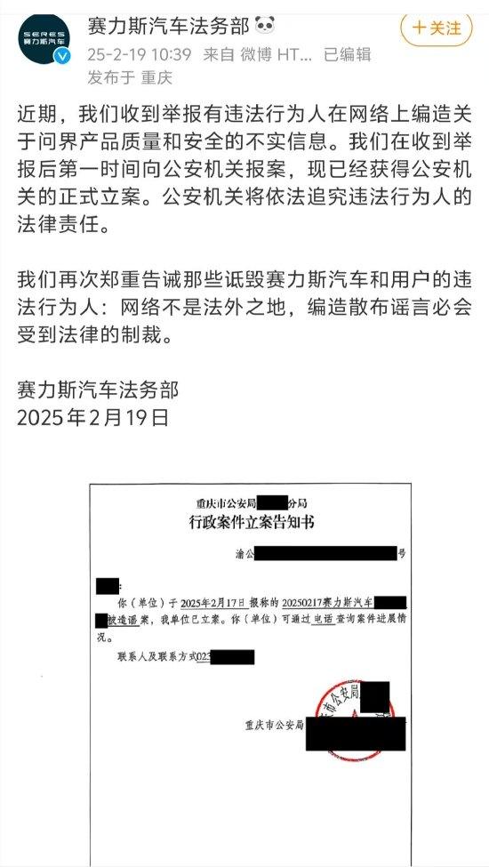 赛力斯汽车法务部再次警告诋毁公司和用户的违法者,表示网络不是法外之地,编造散布谣言必将受到法律制裁。