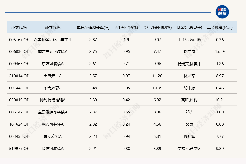 每经记者 赵云 每经编辑 肖芮冬 2月19日,市场全天震荡反弹,创业板指领涨,北证50指数涨超5%。板块方面,人形机器人、半导体、可控核聚变、算力等板块涨幅居前,银行等少数板块下跌。全市场超4600只个股上涨,逾200股涨超9%。沪深两市全天成交额1.72万亿元,较上个交易日缩量781亿。 下面一起来看今天公募基金的表现。 (注:榜单1、2仅选取灵活配置型、偏股混合型和普通股票型三类产品作为主动基金的代表,纳入统计;债基相关榜单包括各类主、被动债券型基金) 1.单日涨幅榜 2.单日跌幅榜 3.单日债基涨跌幅榜 4.晚间值得关注的消息 【两部门:鼓励外资在华开展股权投资 引导更多优质外资长期投资我国上市公司】 国办转发商务部、国家发展改革委《2025年稳外资行动方案》,鼓励外资在华开展股权投资。抓好《外国投资者对上市公司战略投资管理办法》落实,制定发布实施战略投资的操作指引,加大对上市公司、境外基金和投资机构等的宣介力度,引导更多优质外资长期投资我国上市公司。 |