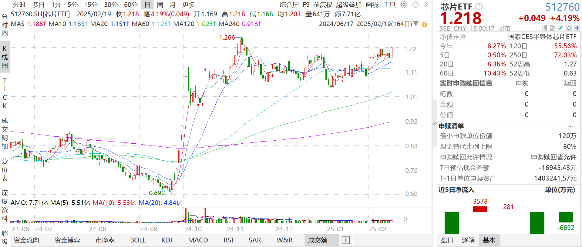 每经编辑 彭水萍 2月19日,A股单边上行,市场逾4600股上涨,科技股全面反弹。上证指数收涨0.81%报3351.54点,中证A500涨0.97%,市场成交1.75万亿元。 半导体芯片板块整体上涨,芯片ETF(512760)、半导体设备ETF(159516)、集成电路ETF(159546)收盘分别收涨5.01%、4.19%和4.32%。 上涨原因分析:本土化需求扩张,晶圆厂扩产预期强化,AI大趋势下半导体芯片产业链国产化率有望显著提升。 2月18日亦庄新城YZ00-0606街区0001-2地块工业用地项目竞拍结果公布,亦庄新城YZ00-0606街区0001地块测量成果报告书的建设单位显示为中芯京城集成电路制造(北京)有限公司,拟建项目总投资不低于500亿元,项目固定资产投资不低于400亿元,达产年产值不低于60亿元。 近期意法半导体率先与华虹合作,计划到2025年底,实现在华虹无锡工厂生产相关MCU芯片。海外大厂产品选择直接中国生产包括中国供应链的成本效益、兼容性及市场政策、地缘政治问题,后续有望看到更多的中国本土化需求。 另外华虹半导体此前披露自公司首次公开发行人民币普通股股票并于科创板上市之日(2023年8月7日)起三年内,在履行政府主管部门审批程序后,华虹集团将华力微(华虹五厂)注入华虹半导体。而华虹六厂生产更先进的制程节点,近期市场对先进制程资产注入预期强化。 后市展望:当前AI产业趋势明确,端侧的发展较为迅速,另一方面美国对华的AI制裁节奏趋紧,国产算力产业链存在较大机遇。 据SIA的数据,2024年全球半导体销售额首次超过6000亿美元,达到6276亿美元,同比增长19.1%,预计2025年将继续保持两位数增长。 中芯国际2024年第四季度实现营业收入22.07亿美元,同比增长31.5%。关于未来的指引,中芯国际预计2025年一季度销售收入环比增长6%-8%,毛利率介于19%-21%之间。虽然一季度为传统淡季,但客户基于国际形势和消费刺激政策而提前拉货,且中国市场消费刺激政策带动销售量和客户备货意愿提高,因此上半年急单增多,带动产能利用率表现较好。 AI应用端爆款不断,同时DeepSeek自上线后迅速在全球范围内获得关注,作为国产AI大模型,多家国产GPU厂商宣布已完成与其的适配。通过与DeepSeek等国产大模型的适配,国内全功能GPU对复杂AI任务的支持能力将得到验证和优化,有助于国内AI全产业链发展。 2025年存储和逻辑芯片客户扩产订单有望在上半年逐步落地,尤其先进制程扩产可能会超预期,有望显著拉动整体的设备需求,同时带动国产化率提升。 当前AI产业趋势明确,端侧的发展较为迅速,另一方面美国对华的AI制裁节奏趋紧,国产算力产业链存在较大机遇,可以持续关注芯片ETF(512760)、半导体设备ETF(159516)和集成电路ETF(159546)的投资机会。 风险提示: 本速评已力求报告内容的客观、公正,但对这些信息的准确性和完整性不作任何保证,文中的观点、结论和建议仅供参考,相关观点不代表任何投资建议或承诺。行业或板块短期涨跌幅列示仅作为市场行情分析的辅助材料,仅供参考,不构成投资建议或承诺。 我国基金运作时间较短,不能反映股市发展的所有阶段。基金管理人承诺以诚实信用、勤勉尽责的原则管理和运用基金资产,但不保证本基金一定盈利,也不保证最低收益。基金的过往业绩及其净值高低并不预示其未来业绩表现。基金管理人提醒投资人基金投资的“买者自负”原则,在做出投资决策后,基金运营状况与基金净值变化引致的投资风险,由投资人自行负担。基金有风险,购买过程中应选择与自己风险识别能力和承受能力相匹配的基金,投资需谨慎。 投资人应当充分了解基金定期定额投资和零存整取等储蓄方式的区别。定期定额投资是引导投资人进行长期投资、平均投资成本的一种简单易行的投资方式。但是定期定额投资并不能规避基金投资所固有的风险,不能保证投资人获得收益,也不是替代储蓄的等效理财方式。 |