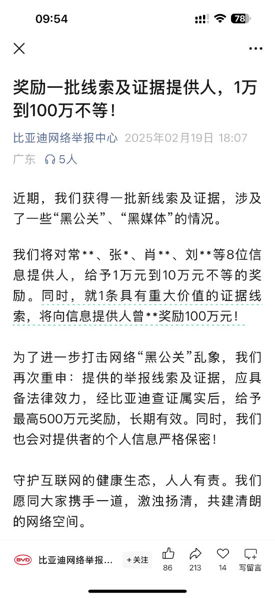 比亚迪网络举报中心宣布将对揭露“黑公关”、“黑媒体”行为的举报者进行高额奖励,最高可达500万元。其中,对重大价值的证据线索最高奖励100万元,常某等8位信息提供人也可获得1万元到10万元不等的奖励。比亚迪表示 ...