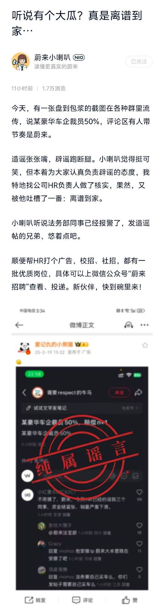 蔚来官方账号针对网传某豪华车企裁员50%的谣言进行了澄清,表示评论区有人故意制造谣言指向蔚来,经核实后证实为假消息,已报警处理。