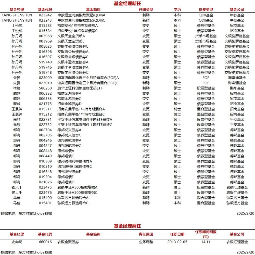 每经AI快讯,据东方财富Choice数据统计,今日新聘基金经理11人,涉及37只基金(A/C类分开计算),主要来自德邦基金、交银施罗德基金等公司。另外,今日有1位基金经理离任。 ![]() |