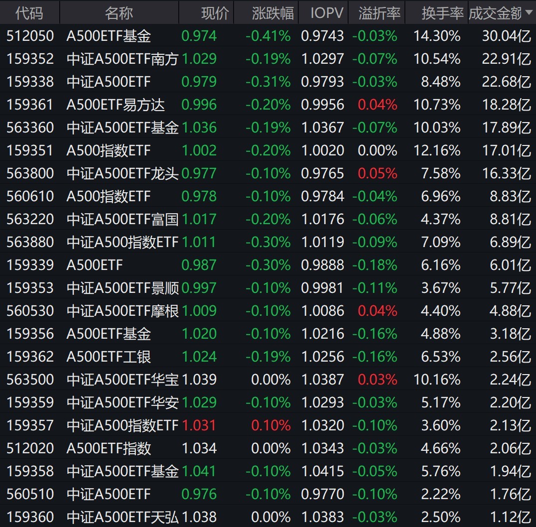 每经记者 叶峰 每经编辑 肖芮冬 市场早盘震荡调整,创业板指领跌。中证A500指数下跌0.13%,成分股中高德红外涨停,万丰奥威、北京君正涨超8%。 截至上午收盘,场内29只跟踪中证A500指数的ETF涨跌互现,其中有22只中证A500相关ETF成交额超1亿元、7只超10亿元,A500ETF基金、中证A500ETF南方、中证A500ETF早盘成交额超20亿元。 此外,有7只中证A500相关ETF换手率超10%,其中A500ETF永赢早盘换手率达42.24%。 有券商表示,当前市场外部环境平稳,宏观逻辑暂让位于产业趋势,科技股行情攻势未完,如短期交易过热导致回调,预计也不会是行情终点,而是还有再布局与进攻机会,继续重点关注政策预期差与产业趋势共振方向。关注行业:互联网、通信、电子、计算机、传媒、有色等。 |