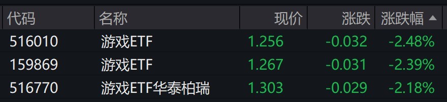 每经记者 叶峰 每经编辑 肖芮冬 游戏股震荡调整,神州泰岳、吉比特跌超4%,三七互娱、恺英网络、掌趣科技、完美世界、光线传媒跌超2%。 受盘面影响,跟踪中证动漫游戏指数的ETF跌逾2%。 中证动漫 ...