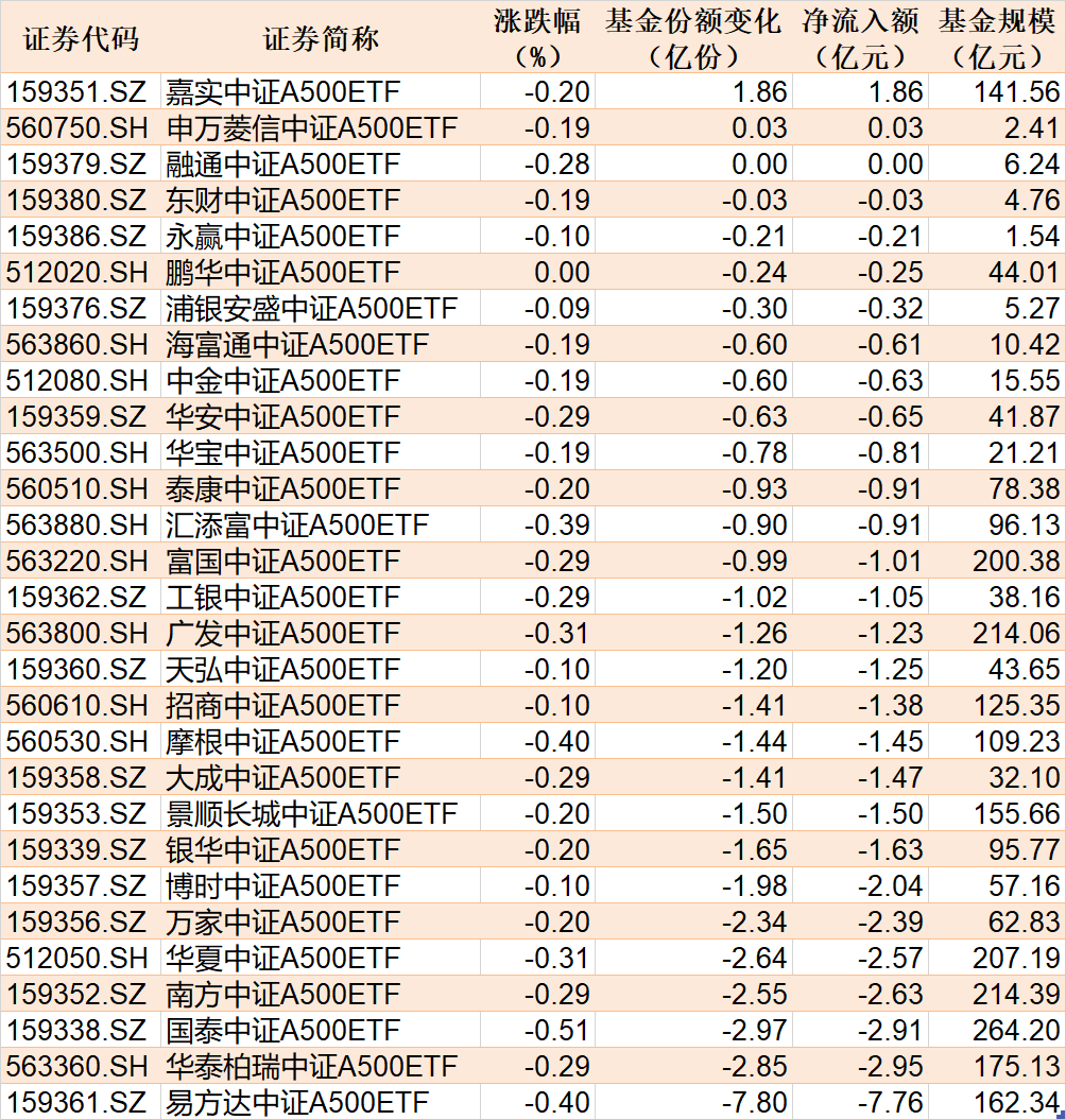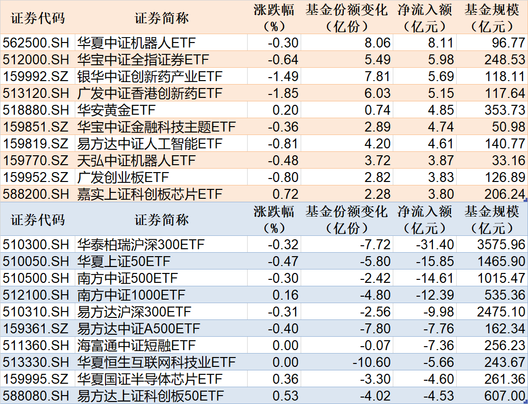 每经记者 叶峰 每经编辑 肖芮冬 昨日市场全天震荡调整,三大指数小幅下跌。沪深两市全天成交额2.08万亿,较上个交易日缩量1121亿。从板块来看,农业股走强,基建股午后拉升,机器人概念股反复活跃,AI概念股走势分化,DeepSeek概念股展开调整。 Wind数据显示,在2月24日的非货币ETF市场中,华夏中证机器人ETF基金份额增加8.06亿份,净流入额为8.11亿元;华宝中证全指证券ETF基金份额增加5.49亿份,净流入额为5.98亿元;银华中证创新药产业ETF基金份额增加7.81亿份,净流入额为5.69亿元。 与此同时,华泰柏瑞沪深300ETF基金份额减少7.72亿份,净流出额为31.40亿元;华夏上证50ETF基金份额减少5.80亿份,净流出额为15.85亿元;南方中证500ETF基金份额减少2.42亿份,净流出额为14.61亿元。 此外,昨日场内29只中证A500ETF合计净流出38.64亿元,其中有2只获得资金增持。 总体看来,Wind数据显示,2月24日全市场ETF份额达到25700.03亿份;总规模为38518.47亿元。份额增加最大的行业为金融,目前有23只基金跟踪;份额增加最大的主题为中证机器人指数,有5只基金跟踪。份额增加最大的指数标的为机器人(+10.03%),有5只基金跟踪;收益最高的指数标的为基建工程(+2.67%),有1只基金跟踪。 |