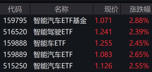 每经记者 叶峰 每经编辑 肖芮冬 智能汽车概念股走强,欧菲光、北京君正涨超5%,立讯精密涨超3%,德赛西威涨超2%。 受盘面影响,跟踪中证智能汽车主题指数的ETF涨超2%。 中证智能汽车主题指数选取 ...