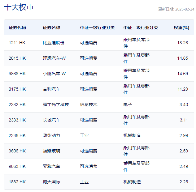 每经记者 刘明涛 每经编辑 叶峰 今日上午,理想汽车宣布其首款纯电SUVi8已进入量产倒计时阶段,作为理想“i”系列的首款车型,i8定位为6座中大型纯电SUV,主打家庭出行场景,目标用户为二胎家庭。受此消息刺激,理想汽车港股半日大涨12%,这也带动港股汽车板块走强,在ETF市场,两只与港股汽车相关ETF半日涨幅均超2.5%,其中,港股汽车ETF(520600)半日成交金额高达10.77亿元。 投资逻辑来看,2025年“以旧换新”政策落地、国四货车纳入报废补贴等,刺激汽车消费需求。车企加速接入AI技术(如DeepSeek),推动智能座舱、自动驾驶技术突破,比如比亚迪“天神之眼”等系统下探至低价车型,加速“智驾平权”。 另一方面,中汽协预测2025年新能源车销量占比或达48%,叠加车企全球化布局,行业结构性机会明确。 点评:港股汽车ETF(520600)今日上午涨幅达到3.2%,该ETF规模为4.53亿份,半日换手高达191%,成交金额为10.77亿元,该ETF通过布局港股通汽车全产业链,兼具政策红利、技术升级和资金关注等多重逻辑,适合投资者把握汽车行业智能化与电动化的长期趋势。另外,港股通汽车ETF(159323)半日涨幅也达到2.57%,半日成交金额为2.49亿元,上述两只ETF均追踪的是中证港股通汽车产业主题指数。 中证港股通汽车产业主题指数从港股通证券范围内选取50只业务涉及汽车产业的上市公司证券作为指数样本,以反映港股通内汽车产业上市公司证券的整体表现。 中证港股通汽车产业主题指数主要权重股 |