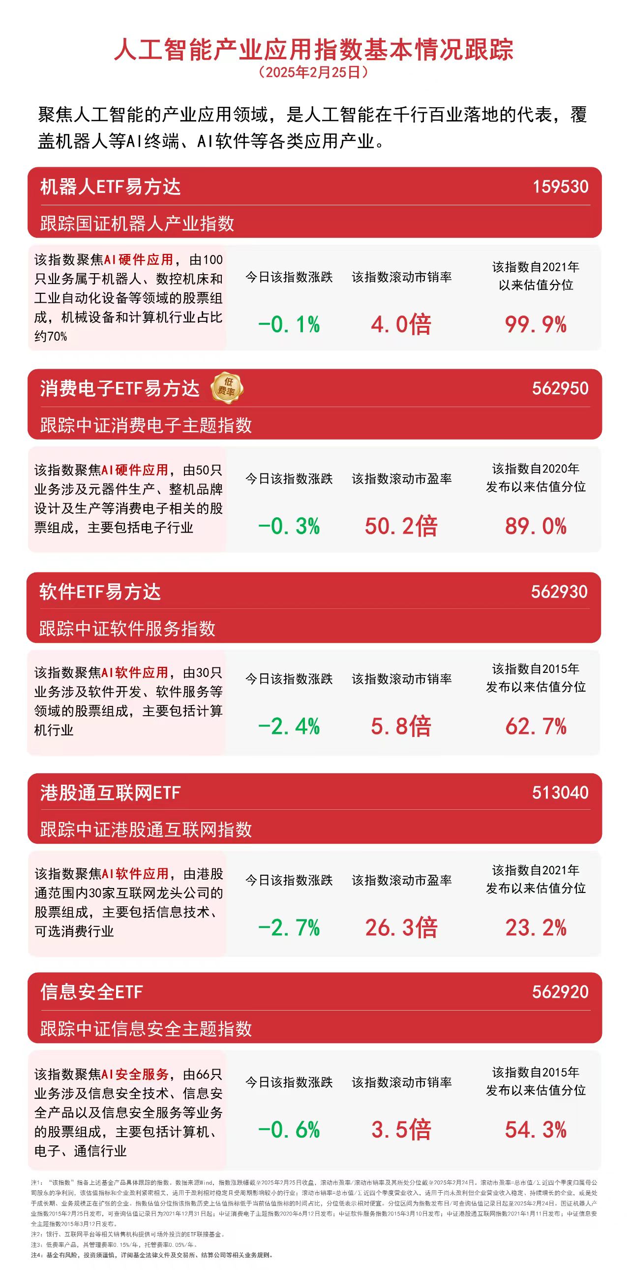 截至收盘,国证机器人产业指数下跌0.1%,中证消费电子主题指数下跌0.3%,中证信息安全主题指数下跌0.6%,中证软件服务指数下跌2.4%,中证港股通互联网指数下跌2.7%。 天风证券指出,在全球流动性宽松预期升温、国内稳增长政策加码背景下,中国科技资产风险回报比突出,外资配置意愿回升,DeepSeek技术突破与头部厂商生态协同,正重塑中国AI产业全球竞争力。 |