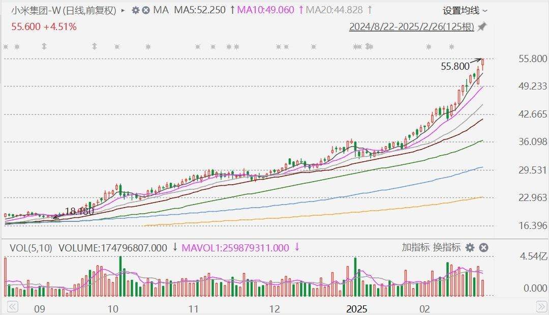 格隆汇2月26日|小米集团-W(1810.HK)涨近5%,至55.8港元,再创历史新高,市值突破1.4万亿港元。雷军称小米SU7Ultra1万台的全年销量目标,