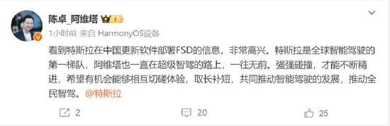 阿维塔科技总裁陈卓对特斯拉在中国更新软件部署FSD的消息表示高兴,并称特斯拉是全球智能驾驶的先驱。他表示阿维塔也在追求超级智驾的道路上不断前进,希望能与特斯拉相互学习,共同推动智能驾驶技术的发展,实现全 ...