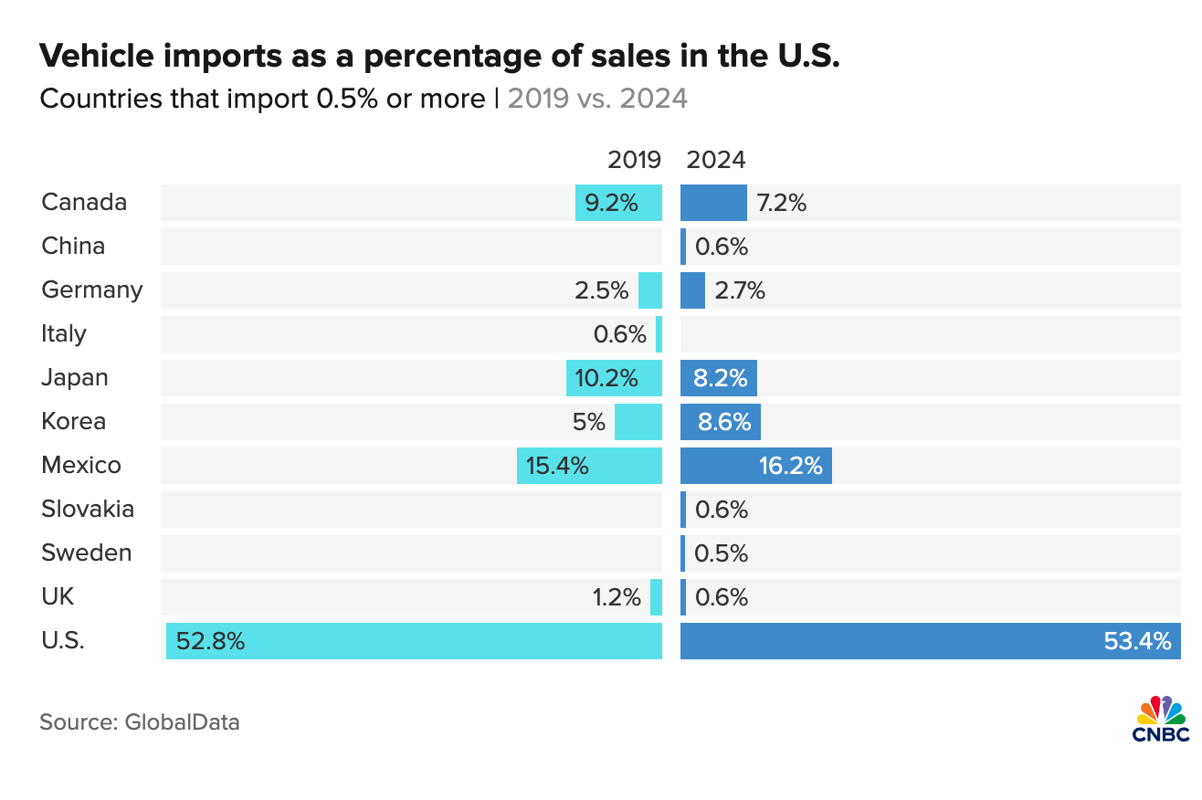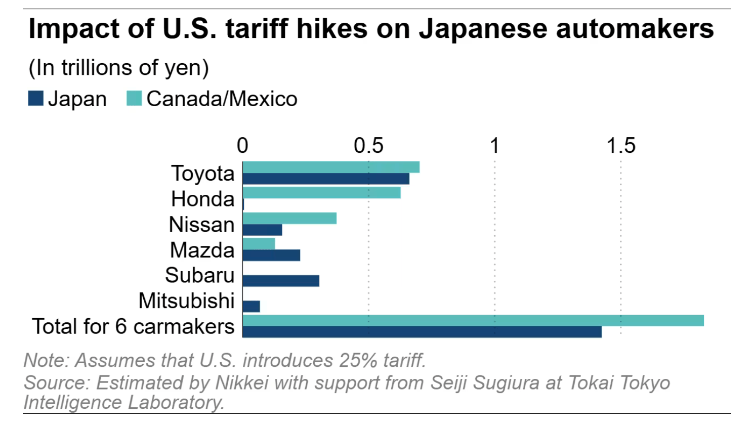 美国总统特朗普计划进一步提高对美国贸易伙伴的关税,将对日本和韩国的汽车行业产生不小的影响。 日韩进口车占美国新车销量的比例仅次于墨西哥 GlobalData的数据显示,去年在美国售出的约1,600万辆汽车中,有46%是进口汽车。其中,韩国和日本生产的汽车分别占美国汽车总销量的8.6%和8.2%,仅次于墨西哥。 2019年和2024年美国进口汽车销量占比;图片来源:CNBC 去年,韩国超过日本和加拿大,成为美国第二大新车进口国。尽管特朗普在第一个任期内与韩国重新谈判了一项贸易协议,但目前美国对韩国产的进口汽车并不征收关税。近年来,日本产汽车占美国销量的比例实际上有所下降,而韩国的进口量和销量持续增长,从2019年的不到84.5万辆增加到2024年的逾137万辆。 白宫没有就是否对韩国产品征收关税的事宜置评。此前,特朗普签署了一份总统备忘录,列出了其对外国征收“互惠关税”的计划,但没有详细说明可能针对哪些国家。 相比之下,汽车制造商从日本出口至美国的产品需缴纳2.5%的关税。去年,在美国售出的汽车中,日本产汽车约占131万辆。根据日本的贸易统计数据,2024年,包括乘用车和卡车在内的汽车占日本对美出口总额的28%,大约6万亿日元(约合396亿美元),是日本对美出口额最大的单一类别;第二大出口类别是汽车零部件,约占日本对美出口总额的6%。 尽管如此,据日本汽车协会估计,日本制造商在美国生产的汽车已经超过了他们从日本出口到美国市场的汽车。2023年,日本汽车制造商在美国生产了330万辆汽车,从日本出口到美国的汽车为150万辆。 为了准备对进口商品征收互惠关税,特朗普已下令调查对美国商品征收更高关税或设置非关税贸易壁垒的国家。虽然日本没有对进口汽车征收关税,但一位白宫官员表示,日本存在“结构性壁垒”,比如其工业和安全标准。 在特朗普威胁要对进口汽车征收25%的关税后,日本向美国提出了汽车关税问题。日本经济产业省大臣Yoji Muto向媒体表示:“汽车工业是日本的关键产业。我们将仔细研究美国即将实施的措施以及这些措施对日本的影响。” 此外,如果美国对个别汽车零部件征收关税,再加上特朗普最近宣布的钢铁和铝关税,情况将进一步复杂化,即使将产品的生产转移到美国,成本也会上升。如果为了转移关税带来的成本而上调产品价格,进口汽车的竞争力就会下降。 福特汽车首席执行官Jim Farley曾表示,如果特朗普打算实施影响汽车行业的关税,就应该“全面”审视所有国家,以平衡北美的竞争环境。Farley在福特去年第四季度财报电话会议上表示:“在进入我国的汽车中,有数百万辆不适用这些(增量关税)。因此,如果我们要制定关税政策……最好是对行业全面实行。” 日韩车企多受影响 在韩国,现代汽车是对美国最大的汽车出口商,其次是通用汽车和起亚汽车。 针对美国的关税计划,现代汽车强调,自1986年进入美国市场以来,其在美国的投资总额已达205亿美元,但没有直接评论潜在关税将带来的影响。“近四十年来,现代汽车一直是美国经济增长和创新的驱动力之一,为美国的繁荣创造了就业机会、经济活动和投资。我们欢迎与新政府合作的任何机会,支持美国制造业,保护供应链,刺激创新。” 近年来,通用汽车从韩国出口至美国的汽车明显增长。根据GlobalData的数据,该公司在美国销售的韩国产汽车(主要是入门级车型)已从2019年的17.3万辆增加到去年的超过40.7万辆。根据通用汽车网站的信息,该公司是韩国制造业最大的外国直接投资者。自2002年在韩国设立业务以来,该公司已投资9万亿韩元(约合62亿美元)。 通用汽车在韩国的工厂生产别克Encore GX和别克Envista跨界车,以及雪佛兰Trailblazer和雪佛兰Trax跨界车,而这些产品帮助通用在利润率较低的入门级市场依然实现盈利增长。通用汽车总裁Mark Reuss在该公司去年10月份的投资者日上表示:“新款雪佛兰Trax和别克Envista将我们在美国小型SUV市场的份额提高到2007年以来的最高水平。” 日本汽车制造商面临的挑战似乎更大。根据日经网的报道,特朗普计划对进口汽车征收25%的关税,以及其他威胁要征收的关税,可能会让日本六大汽车制造商额外支付高达3.2万亿日元(约合210亿美元)的关税,使马自达和斯巴鲁等企业更难在市场上竞争。因此,日本汽车制造商正考虑在美国总统特朗普征收更高关税之前调整生产计划,最快可能会在几周内采取相关措施。 日本六大汽车制造商需额外支付的关税;图片来源:日经网 本田首席财务官Eiji Fujimura表示,本田每年向美国出口55万辆在墨西哥和加拿大生产的汽车,并从美国向上述两个邻国出口6万辆汽车,因此每年总计约61万辆汽车将受到美国关税政策的影响。根据该公司的初步计算,如果特朗普的关税计划正式实施,3月份对该公司的影响约为200亿日元。本田执行副总裁Shinji Aoyama称,“我们尽可能在2月底之前将墨西哥和加拿大的生产工作转移到美国”,而且考虑调整在墨西哥和加拿大生产的车型。 研究公司MarkLines的数据显示,日产和马自达在美国销售的汽车中,分别有三分之一和四分之一是从墨西哥进口。日产汽车在美国有两家汽车组装厂,但其Kicks等车型是在墨西哥生产,而其Rogue的部分车型是从日本进口。日产汽车首席执行官内田诚(Makoto Uchida)表示,美国对从墨西哥产汽车加征关税将“对业务产生重大影响”,而日产或将部分进口车型的生