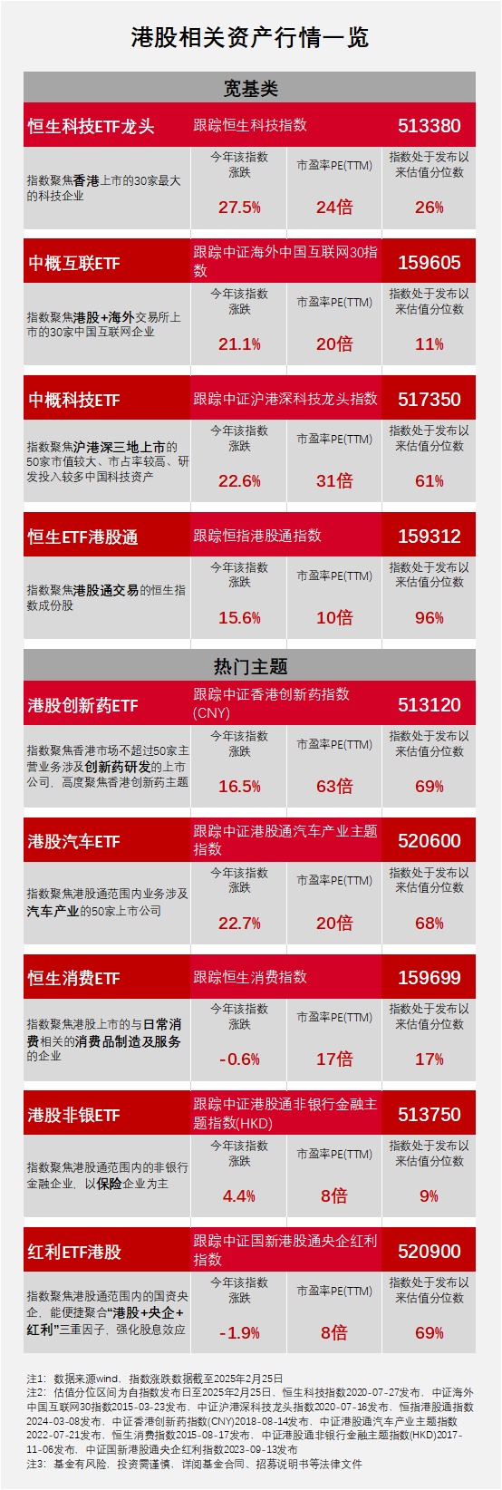 2月26日,港股市场高开高走,资金加仓效应显著。其中,南向资金净买入额再度超过100亿港元,算上前三日已连续4日净买入超百亿港元。事实上,自2025年以来,南下资金加大港股买入力度,截至2月25日,累计净买入港股近2400亿港元,科技、互联网、创新药、汽车等板块成为资金加仓核心方向。 盘面上,中概互联ETF(159605)、恒生科技ETF龙头(513380)、港股创新药ETF(513120)、港股汽车ETF(520600)交投活跃度居前,截至2月25日,上述品种近4个交易日日均成交额均在7亿元以上,其中,港股创新药ETF(513120)日均成交额达26亿元,活跃度在全市场创新药主题ETF中居首。 对于港股走势,中信证券认为,即便在此轮港股上涨后,截至2月21日,目前恒生指数和恒生科技指数的动态PE分别为10.4/18.7倍,处于历史44.8%/30.7%分位数。而港股主要指数2025年的业绩预期在三季报后也呈现上修趋势,自去年11月底以来,Bloomberg一致预期显示,恒生科技的2025年收入和净利润预期分别上修了7.7%和6.2%。综合来看,在AI叙事持续催化、企业基本面预期上修、全球资金轮动的背景下,后续港股大概率将延续2024年以来的反转行情。 长江证券指出,在“AI+”产业链爆发的背景下,港股正从“红利牛”迈向“AI牛”。随着AI格局改变,拥有较多AI应用和底层技术的港股科技公司或迎来产业生命周期的“第二春”,从价值股重新蜕变为成长股,业绩兑现或许需要一些时间,但估值的重构已经出现。港股“AI含量”突出,在AI产业链图谱不断延伸下,港股正从“红马时代”切向“AI牛”。 |