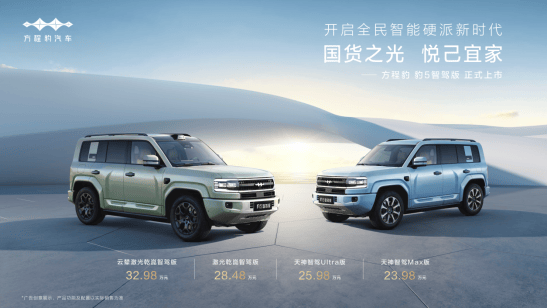 在动力与性能方面,豹 5 智驾版依托 DMO 电驱越野开创平台,最大功率达 505kw,综合续航 1200km,亏电油耗仅 7.8L,百公里加速 4.8 秒,完美解决传统硬派车的痛点。搭配与百万级高端品牌仰望同款的云辇 - P 百万液压悬架系统,阻尼、高度、刚度可调节,车辆操控性和驾乘质感大幅提升。 舒适与安全配置上,豹 5 智驾版也毫不含糊。“冰箱彩电大沙发”“按摩香氛帝瓦雷” 一应俱全,营造极致舒适体验。安全层面,整车基于五星安全设计,主动安全系统实时监测路况、主动避险;非承载式大梁车身、超高强度笼式座舱以及安全性能卓越的刀片电池,全方位守护出行安全。 豹 5 智驾版此次共发布 4 大版本,售价 23.98 万元 - 32.98 万元。凭借融合智能与性能科技,以及打造的安享空间,已成为消费者心目中的超值之选。目前,消费者可通过方程豹汽车 APP、微信小程序或线下门店预约品鉴和购车,开启智能硬派出行新体验。 (责任编辑:曹言言 HA008)