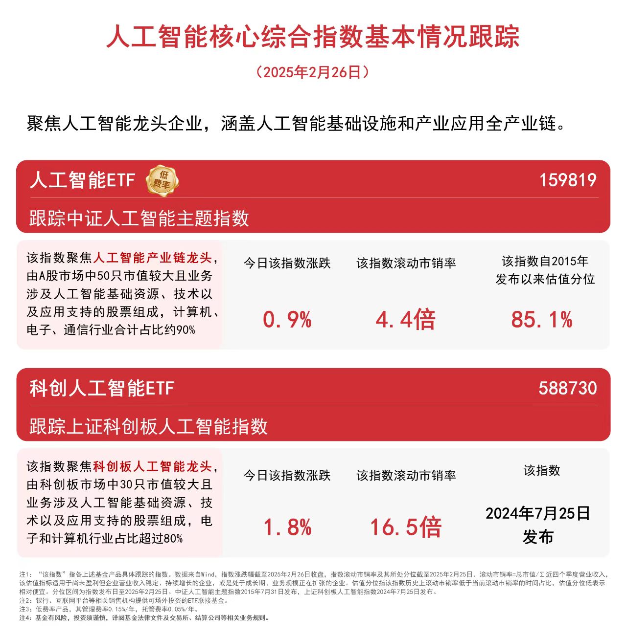 人工智能板块今日反弹,截至收盘,中证人工智能主题指数上涨0.9%,上证科创板人工智能指数上涨1.8%。Wind数据显示,截至昨日,人工智能ETF(159819)连续7个交易日获资金净流入,合计达23亿元,最新规模超140亿元,位居同类产品第一。 银河证券指出,AI技术应用持续落地,推动行业深刻变革,已经应用AI技术的公司有望在生产服务效率、产品品质等方面持续优化,具备先发优势,同时,部分企业参与AI消费品供应链,有望充分受益于未来行业成长。 |