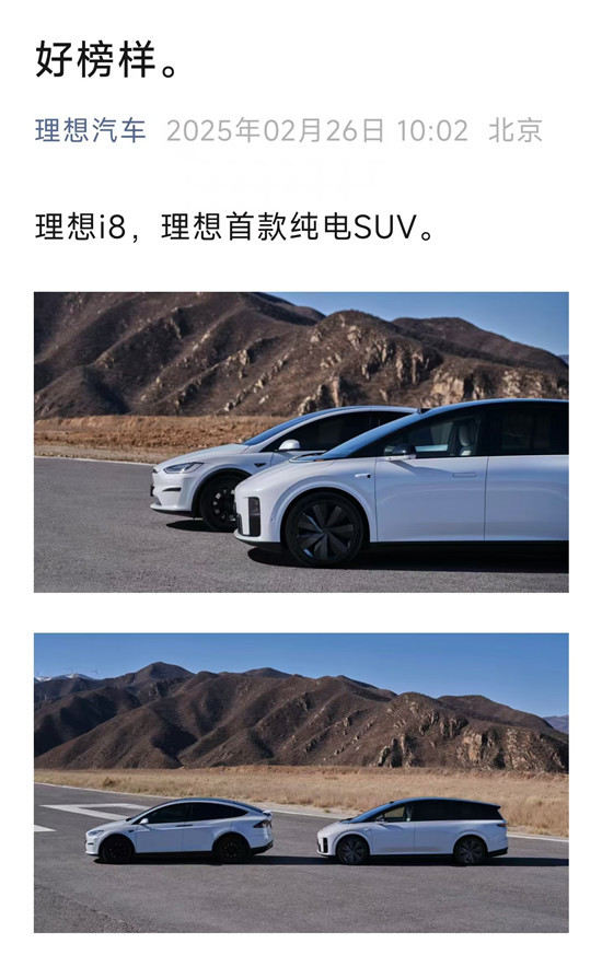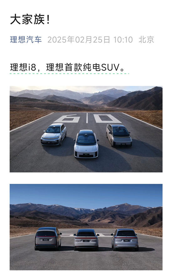 一张官图撬动300亿市值。这一波资本市场的狂欢,正是外界对理想汽车二次冲锋纯电赛道投下的“信心票”。与此同时,从增程式“舒适区”向纯电“深水区”,再次出发的理想汽车,步伐也更为稳健。 理想汽车首款纯电SUV终于露出庐山真面目。 2月25日,理想汽车正式发布首款纯电SUV――理想i8的官方图片,展示了新车的前脸与尾部设计。据悉,i系列作为理想汽车全新打造的纯电SUV系列,将与现有的L系列(增程式)、MEGA(纯电MPV)并驾齐驱,共同构建理想汽车产品矩阵“大家族”。