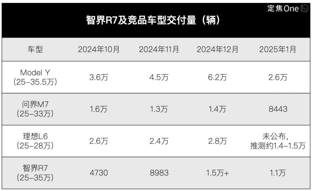 M7主打25万级增程大五座SUV,在同类型竞品中上市较早,有先发优势。智界R7比M7上市晚,市场竞争非常激烈,对手除了问界M7(30-40万元豪华SUV销量榜首),还有Model Y(稳居中型SUV市场第一)、理想L6(25万级增程式SUV销冠)等。