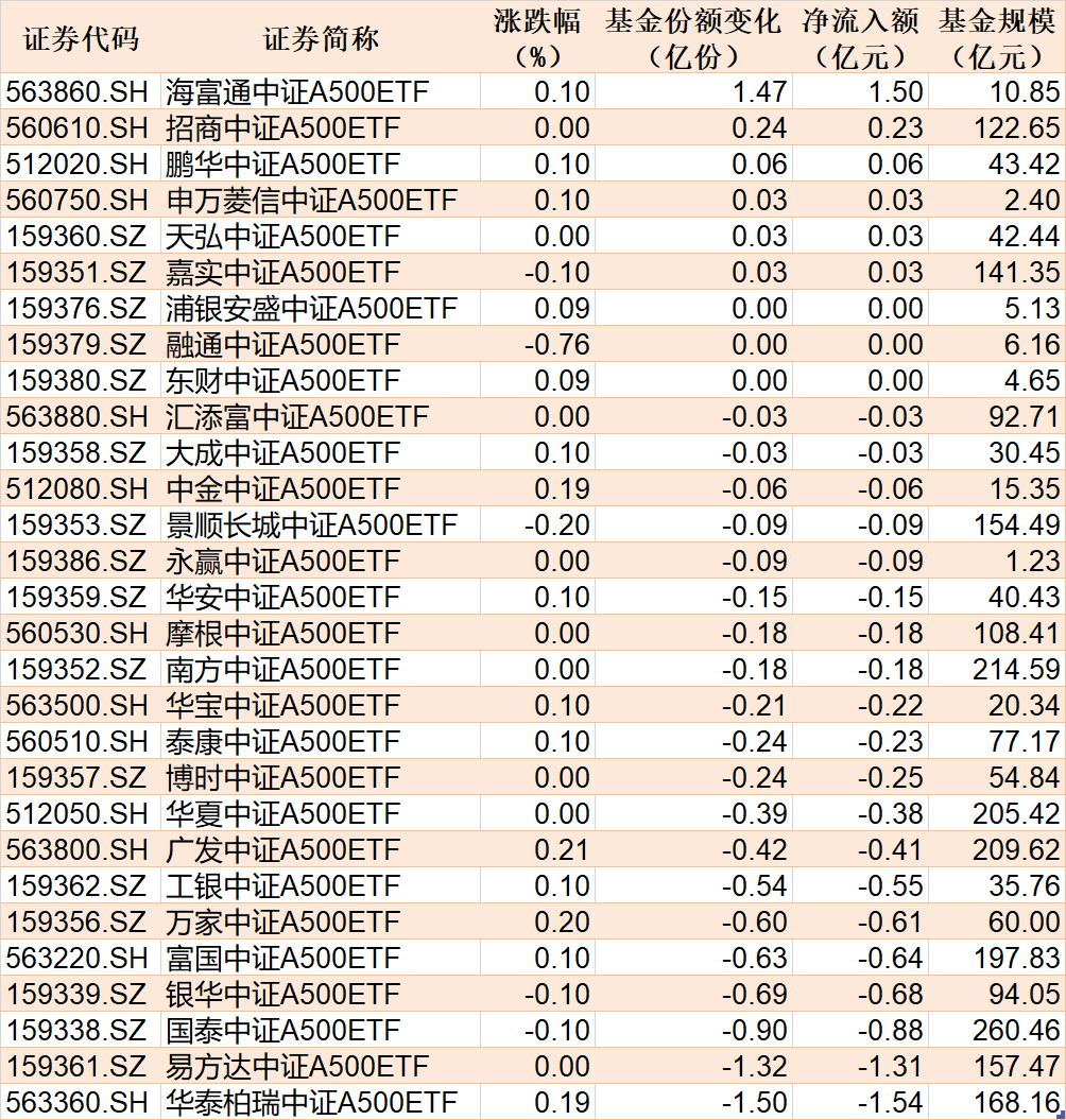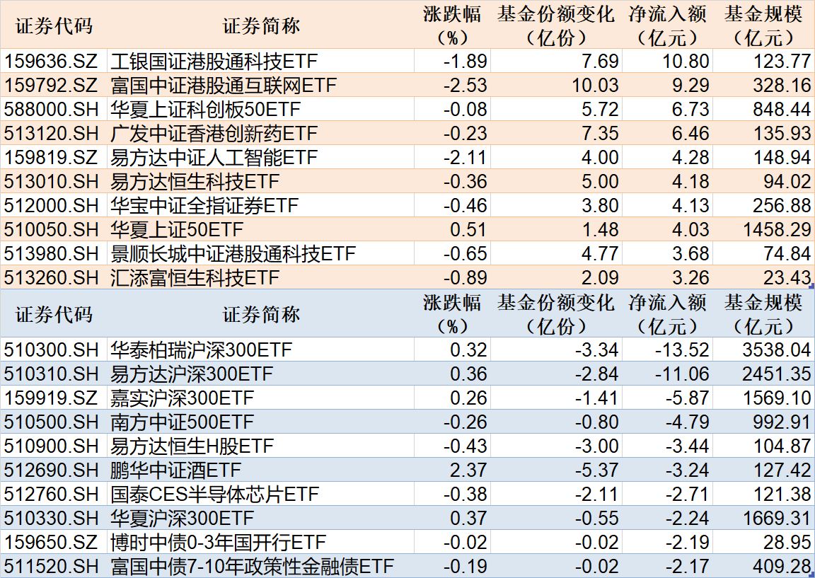 每经记者 叶峰 每经编辑 彭水萍 昨日市场全天探底回升,三大指数涨跌不一。从板块来看,大消费股集体走强,乳业、零售、食品等方向领涨,券商股尾盘再度拉升,固态电池概念股持续活跃。下跌方面,算力概念股集体调整。 Wind数据显示,在2月27日的非货币ETF市场中,工银国证港股通科技ETF基金份额增加7.69亿份,净流入额为10.80亿元;富国中证港股通互联网ETF基金份额增加10.03亿份,净流入额为9.29亿元;华夏上证科创板50ETF基金份额增加5.72亿份,净流入额为6.73亿元。 与此同时,华泰柏瑞沪深300ETF基金份额减少3.34亿份,净流出额为13.52亿元;易方达沪深300ETF基金份额减少2.84亿份,净流出额为11.06亿元;嘉实沪深300ETF基金份额减少1.41亿份,净流出额为5.87亿元。 此外,昨日场内29只中证A500ETF合计净流出6.61亿元,其中有6只获得资金增持。 总体看来,Wind数据显示,2月27日全市场ETF份额达到25918.47亿份;总规模为38687.81亿元。份额增加最大的行业为金融,目前有23只基金跟踪;份额增加最大的主题为中证人工智能,有3只基金跟踪。份额增加最大的指数标的为恒生科技(+1.80%),有10只基金跟踪;收益最高的指数标的为港股通汽车(+2.92%),有2只基金跟踪。 |