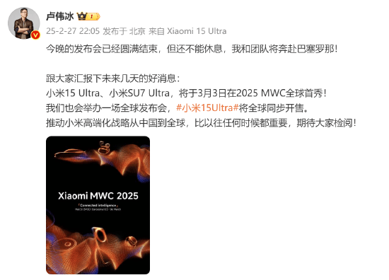 小米在发布会后表示,将在未来几天在巴塞罗那举办MWC全球首秀,展示小米15 Ultra和小米SU7 Ultra,并将在全球同步开售。这标志着小米高端化战略从中国向全球拓展。 ...