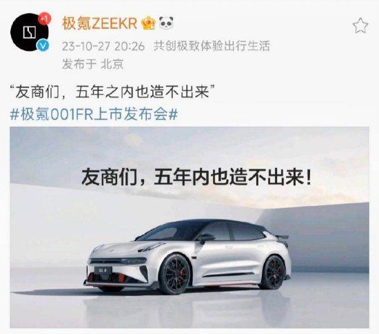 同辰科技讯 2月28日上午消息,极氪官微今日发文:“祝贺小米SU7 Ultra成功发布”,并@小米汽车 。官方发布的贺图中,出现了2023年发布的同样是性能取向的车型 ―― 极氪001 FR。 据悉,极氪001 FR售价76.9万起,号称“地表最强”性能纯电猎装轿跑,零百加速2.02秒,0到200km/h加速仅需6.29秒,极氪汽车官方曾在001 FR发布时自信放话:“友商们五年之内也造不出来”。(罗宁) (责任编辑:宋政 HN002)