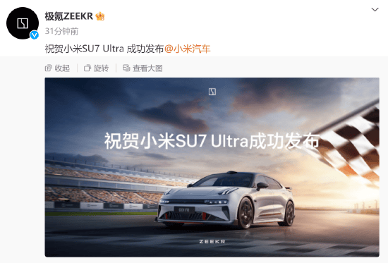 极氪官方在微博上祝贺小米SU7 Ultra成功发布,并展示了2023年发布的同样性能取向的车型极氪001 FR,售价76.9万起。这款车号称“地表最强”性能纯电猎装轿跑,零百加速2.02秒,0到200km/h加速仅需6.29秒。极氪官方对 ...