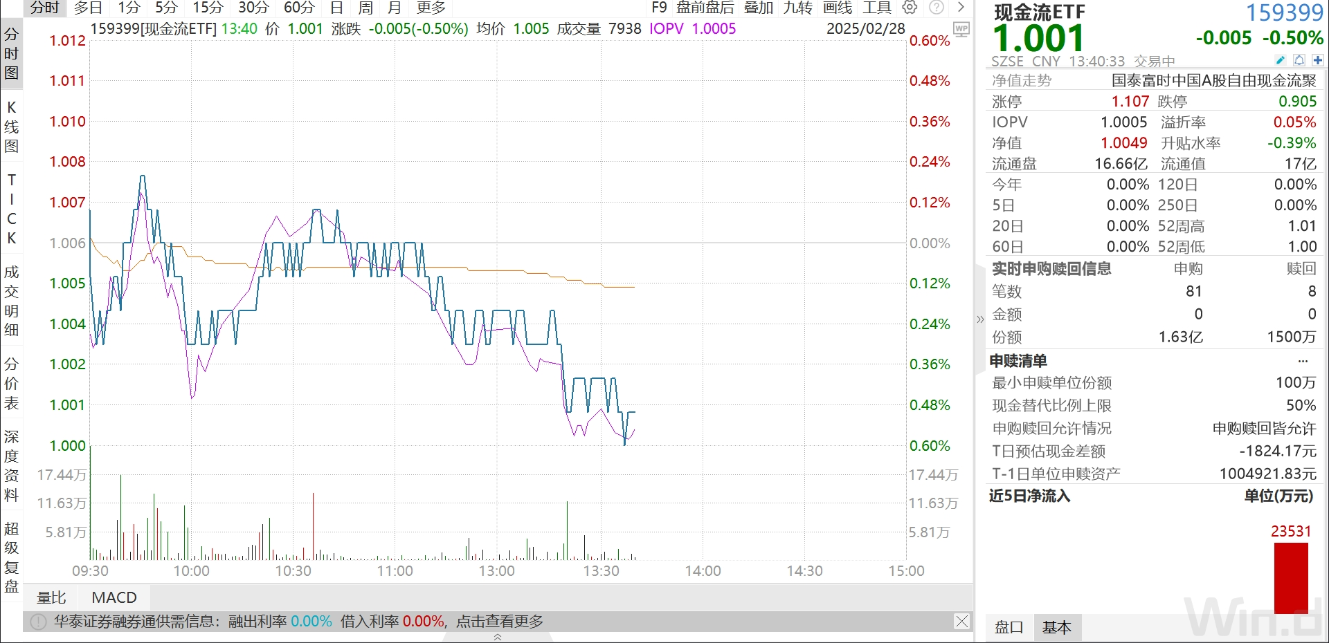 每经编辑 彭水萍 今日,上证指数出现回调,现金流ETF(159399)价值凸显,早盘成交额2.74亿元,交投活跃。值得关注的是,2月27日,现金流ETF(159399)上市首日,净流入资金超2亿。今日交投延续强势,盘中持续净 ...