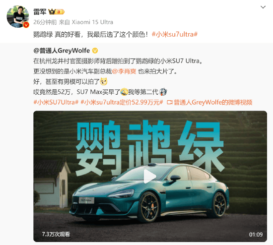 同辰科技讯 2月28日下午消息,雷军在个人微博上转发小米SU7 Ultra相关视频,并表示:鹦鹉绿真的好看,我最后选了这个颜色。 据悉,小米SU7 Ultra包含三大色系,五大颜色,包括经典色系:曜石黑、珍珠白;豪华色系:太空银、鹦鹉绿;跑车色系:闪电黄,官方起售价52.99万元。(罗宁) (责任编辑:宋政 HN002)