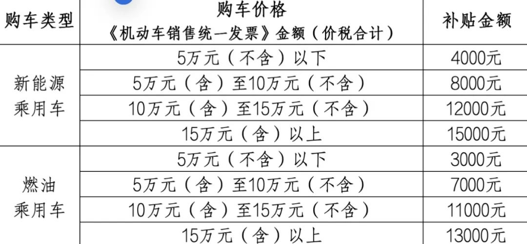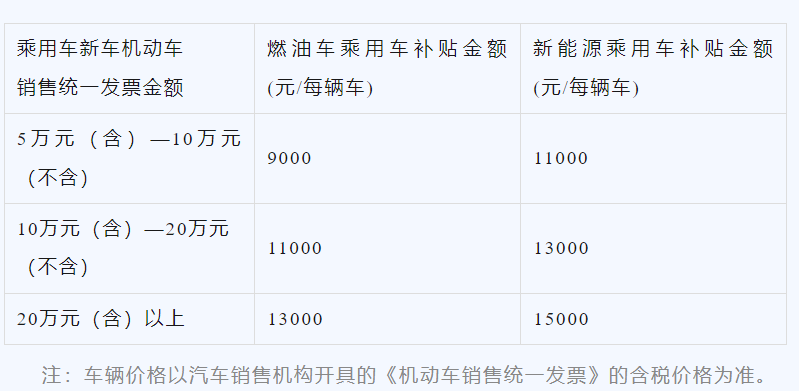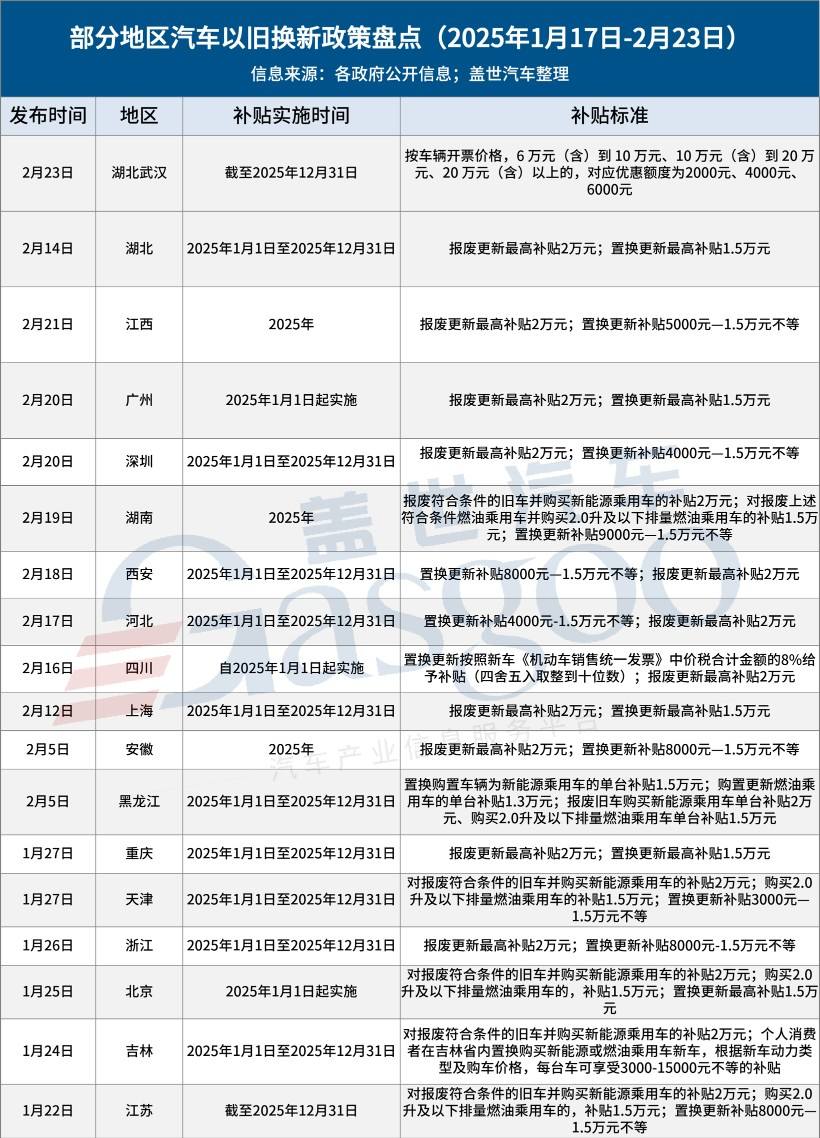 据商务部最新数据显示,2024年全国汽车以旧换新数量突破680万辆,创下历史新高。为了进一步推动这一趋势,2025年1月17日,商务部等8部门出台《关于做好2025年汽车以旧换新工作的通知》,明确报废更新和置换更新补贴标准、补贴方式等明细内容。 在“国补”政策出台后,全国各地积极响应,纷纷推出具体措施。据盖世汽车不完全统计,从1月中旬至2月23日期间,已有超过15个地区包括北京、上海、湖北、江苏、江西、湖南和天津等地出台相关方案,以此来激发汽车消费潜能,提振消费信心,增强消费活力。本篇是相关政策梳理,供业界参考。 湖北 2月23日,据武汉发布公众号显示,武汉今年继续发放汽车消费券,加倍补贴消费者。按车辆开票价格,6 万元(含)到 10 万元、10 万元(含)到 20 万元、20 万元(含)以上的,对应优惠额度分别为2000元、4000元、6000元。凡在湖北省内购买岚图、猛士、奕派、东风本田、莲花等符合条件的对应车型(含新能源和燃油车),都能享受优惠。 官方表示,本次消费券购买新车即可享受,无需以旧换新;新能源乘用车与燃油车享受同等优惠标准;覆盖个人消费者和非营运企业;可与国家、省市相关促销政策叠加使用,即时抵扣、核销便捷。活动将于2025年12月31日结束,先到先得。 此外,在2月14日,湖北省商务厅官网发布《2025年湖北省汽车以旧换新政策问答》,明确了今年湖北落实国家汽车报废更新补贴和实施本省汽车置换更新补贴的实施范围、补贴对象、补贴标准等。 其中,对报废符合条件的旧车并购买新能源乘用车的个人消费者补贴2万元;购买2.0升及以下排量燃油乘用车的补贴1.5万元。 汽车置换更新补贴方面,自2025年1月1日至2025年12月31日,个人消费者在湖北省内转让登记在本人名下的乘用车并购买乘用车新车,转让车辆、新购车辆分别完成转让登记、注册登记,按新购乘用车含税销售价格分档给予一次性补贴,具体补贴如下图: 图片来源:湖北发布 江西 2月21日消息,江西省商务厅等11部门日前印发了《江西省2025年加力扩围消费品以旧换新实施细则》的通知。 其中提及对个人消费者转让登记在本人名下乘用车旧车并在江西购买乘用车新车的,给予一次性补贴支持。补贴标准按照购买新车价格(购车发票金额价税合计)分为四档:1.新车价格5万元(不含)以下的,补贴5000元;2.新车价格5万元(含)至10万元(不含)以下的,燃油乘用车补贴8000元、新能源乘用车补贴10000元;3.新车价格10万元(含)至20万元(不含)的,燃油乘用车补贴10000元、新能源乘用车补贴12000元;4.新车价格20万元(含)以上的,燃油乘用车补贴13000元、新能源乘用车补贴15000元。 此外,对个人消费者报废符合条件的旧车并购买新能源乘用车的,补贴2万元;购买2.0升及以下排量燃油乘用车的,补贴1.5万元。 广州 2月20日,据广州市商务局发布的《2025年广州市汽车以旧换新操作指引》显示,2025年度汽车报废更新、置换更新政策自2025年1月1日起实施。同一个消费者名下的同一辆新车,只能选择申领汽车置换更新补贴或者报废更新补贴。其中,报废更新最高补贴2万元,置换更新最高补贴1.5万元/辆。 深圳 2月20日,深圳市商务局发布《深圳市汽车置换更新补贴实施指引(2025 年)》《深圳市汽车报废更新补贴实施指引(2025 年)》,其中在汽车置换更新方面,对个人消费者转让本人名下车辆,并在深圳市内新购新能源车或符合国六排放标准的燃油车,给予一次性购车补贴。 购车价格为4万元(含)至7万(不含)元的,购买燃油车补贴4000元/辆,新能源车补贴 5000 元 / 辆;购车价格为 7 万元(含)至 15 万元(不含)的,购买燃油车补贴 8000 元 / 辆,新能源车补贴 9000 元 / 辆;购车价格为 15 万元(含)至 25 万元(不含)的,购买燃油车补贴 12000 元 / 辆,新能源车补贴 13000 元 / 辆;购车价格为 25 万元(含)以上的,购买燃油车补贴 13000 元 / 辆,新能源车补贴 15000元/辆。 汽车报废更新方面,报废符合条件旧车并购买新能源乘用车的补贴 2 万元;对报废符合条件燃油乘用车并购买 2.0 升及以下排量燃油乘用车的,补贴 1.5 万元。 湖南 2月19日,《2025年湖南省汽车、电动自行车以旧换新实施细则》发布。其中提及报废符合条件的旧车并购买新能源乘用车的,补贴2万元;对报废上述符合条件燃油乘用车并购买2.0升及以下排量燃油乘用车的,补贴1.5万元。 汽车置换更新方面,对个人消费者转让登记在本人名下符合条件的乘用车,并在湖南省内购买符合条件乘用车新车,给予一次性定额补贴,补贴以现金方式发放,具体补贴如下: 图片来源:长沙商务 西安 2月18日,《2025年西安市加力扩围消费品以旧换新政策措施及实施方案的通知》发布,支持汽车报废和置换更新。 其中,汽车置换更新的补贴范围为,自2025年1月1日(以下日期均含当日)至2025年12月31日,个人消费者转让本人名下乘用车,并在西安市新购置乘用车;转让的旧乘用车、新购置的乘用车分别完成转让登记、注册登记;按照新购置的乘用车发票价格分档给予一次性定额补贴。 补贴标准为,购置新车为新能源乘用车:发票价格15万元(不含)以下的,单辆补贴10000元;15万元(含)以上的,单辆补贴15000元。购置新车为燃油乘用车:发票价格15万元(不含)以下的,单辆补贴8000元;15万元(含)以上的,单辆补贴13000元。 此外,个人消费者报废旧车并购置新能源乘用车的补贴20000元;购置2.0升及以下排量燃油乘用车的补贴15000元。 河北 2月17日,