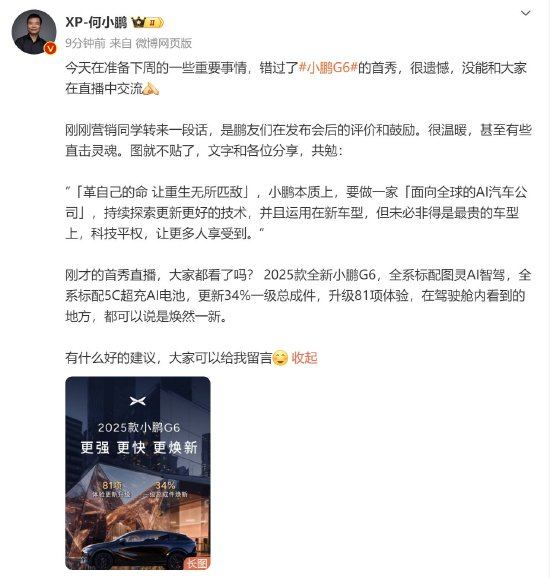 何小鹏在微博上透露错过了小鹏G6首秀感到遗憾,并表示小鹏汽车要成为面向全球的AI汽车公司,让更多人享受到科技平权。他提到要革自己的命,让重生无所匹敌,并强调要持续探索更新更好的技术应用在新车型上,让更多人 ...