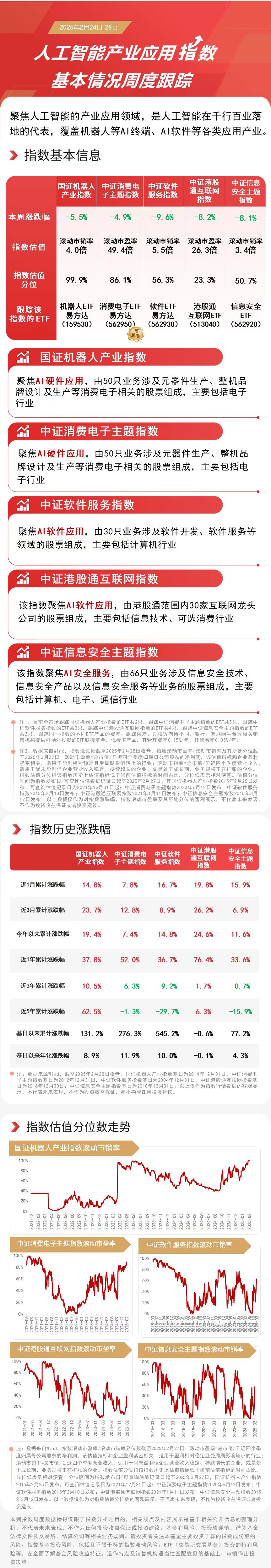 本周中证消费电子主题指数下跌4.9%,国证机器人产业指数下跌5.5%,中证信息安全主题指数下跌8.1%,中证港股通互联网指数下跌8.2%,中证软件服务指数下跌9.6%。 海通证券表示,回顾10-15年A股移动互联浪潮,初期硬件设备投资机会先行,加速期内容和应用端百花齐放。DeepSeek热潮代表AI应用进入1-100加速期,国内在应用阶段或更有优势,云服务商、AI应用,中期算力仍有确定性。 |