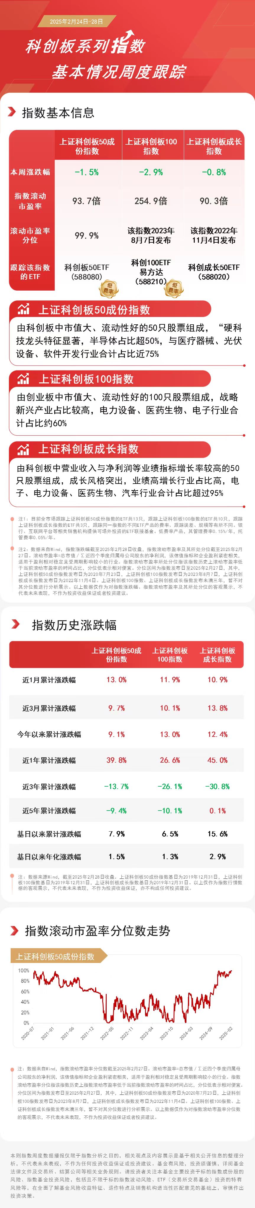 本周上证科创板成长指数下跌0.8%,上证科创板50成份指数下跌1.5%,科创100指数下跌2.9%。 上交所近日表示,将优先支持开展关键核心技术攻关的科技型企业并购重组,加大力度培育壮大科技领军企业和链主型龙头企业,更 ...