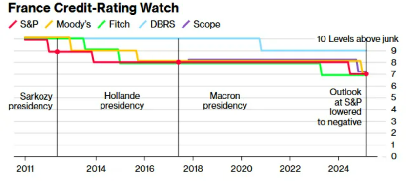 标普下调法国评级展望。 当地时间2月28日,信用评级机构标普全球将法国“AA-/A-1+”信用评级展望从稳定下调至负面。2024年5月,标普就已经下调过法国评级。该评级机构在一份声明中表示,展望的变化反映出“在经济增长前景更加不确定的背景下,以及在解决法国巨额潜在预算赤字的政治共识薄弱的情况下,政府债务将不断上升”。 ![]() 五大评级机构对法国评级变化 标普为何调低展望? 在标普全球的声明中表示,法国2025年预算主要依靠临时性税收措施来实现约0.4%的GDP赤字削减。然而,2025年之后的财政战略仍不明确。标普全球评级还预测,法国今年GDP增长将降至1%以下,这将进一步加剧财政前景的压力。 标普预计,到2028年,法国的平均债务成本将与名义GDP增长持平。为了降低债务与GDP之比,法国需要实现基本预算盈余,而这是自2001年以来从未实现过的。由于这些财政压力和改革缺乏政治支持,法国的主权评级展望被标普调整为负面。 负面展望反映了在经济增长前景不确定的背景下,政府债务上升,同时缺乏强有力的政治共识来解决法国巨大的潜在预算赤字问题。标普全球评级警告称,如果政府在未来两年内未能进一步减少其巨额预算赤字,或者经济增长长期低于预期,评级可能会被下调。 另一方面,如果法国的预算赤字收窄速度快于预期,且经济增长加速,导致净政府债务与GDP之比呈下降趋势,评级则可能会上调。 对于标普全球的最新声明,法国财政部回应称,2025年预算标志着减少预算赤字和控制债务努力的“历史性转折点”。法国财政部表示:“负面前景提醒我们,修复公共财政面临的挑战有多大,这是政府决心迎接的挑战。” 政治斗争影响政府削减赤字 就在2月,法国政府提交的2025年预算在未经议会投票的情况下通过,预算主要依靠收入增加来实现今年估计0.4个百分点的赤字减少。实际上,2025年预算意味着公共消费增长1.1%,使政府总支出保持在GDP的57%以下,这是所有被评级主权国家中最高的。 法国政府承认公共支出比欧洲平均水平高出GDP的10%,主要是由于高社会福利支出。目前,政府正在设立新的支出控制委员会,每两个月审查一次所有政府绩效水平。然而,由于缺乏调整社会福利的授权(社会福利占政府总支出的44%和GDP的约25%),减少支出的进展可能会很缓慢。 即使预算最终敲定,法国政府再次垮台的威胁仍然存在,因为法国总理贝鲁(Francois Bayrou)在国民议会中缺乏多数席位。未来几个月,当议员们就养老金制度的潜在改革以及将最低退休年龄从62岁提高到64岁的有争议的法律进行辩论时,贝鲁与反对党的紧张关系可能会再次出现。 国民议会的政治僵局可能促使总统马克龙最早于今年7月13日召开全国大选。马克龙的任期将于2027年春季结束。 尽管面临挑战,法国经济规模达到3.2万亿欧元,仍是世界第七大经济体。服务板块(包括信息技术、医疗保健、教育、交通、设计、艺术、房地产和旅游业)占总增加值的80%以上。相对较小的制造业规模可能会在某种程度上保护法国免受全球保护主义对增长造成的部分负面影响。 金融市场值得关注 法国和德国10年期国债收益率之差是一个受到密切关注的风险指标,自去年6月马克龙宣布提前举行大选以来,两国国债收益率之差基本上在70 —80个基点之间波动。两国国债利差此前达到90个基点,接近去年遭到严重抛售的水平,当时法国原总理米歇尔·巴尼耶(Michel Barnier)领导的前政府在一次不信任投票后垮台。 目前,法国10年期国债收益率为3.14%,德国则为2.38%。 政治和财政的不确定性已经损害了法国的评级,穆迪去年12月意外下调了法国的评级。去年5月底,就在法国议会选举之前,标普下调了法国的信用评级。标普表示,如果法国政府在未来两年内无法进一步削减庞大的预算赤字,或者经济增长长期低于标准普尔的预测,它可能会对法国的评级采取进一步的负面行动。去年10月,惠誉将法国长期外币发行人违约评级维持在“AA-”,将评级展望从“稳定”调整为“负面”。 在股市方面,法国CAC40指数未受政局动荡影响,年初至今上涨9.9%,并在2月份一度接近历史最高点。其中,银行板块整体表现出色。年初至今,法国兴业银行上涨46.25%,位居法国CAC40指数成份股涨幅榜首,此外,法国巴黎银行、法国农业信贷银行的涨幅分别为24.06%和20.33%,均大幅跑赢指数。 (文章来源:证券时报) |