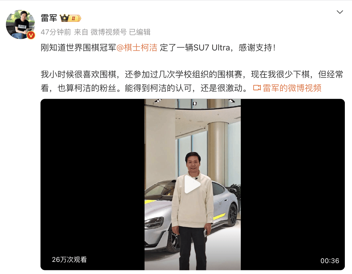 另外,雷军在发文称:刚知道世界围棋冠军柯洁定了一辆SU7 Ultra,感谢支持!
