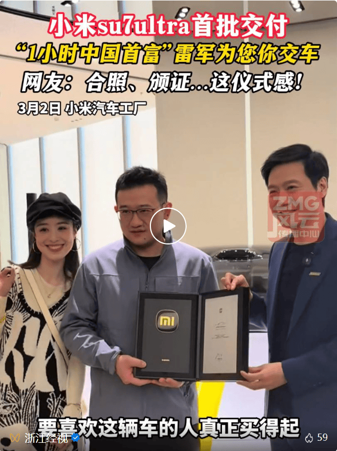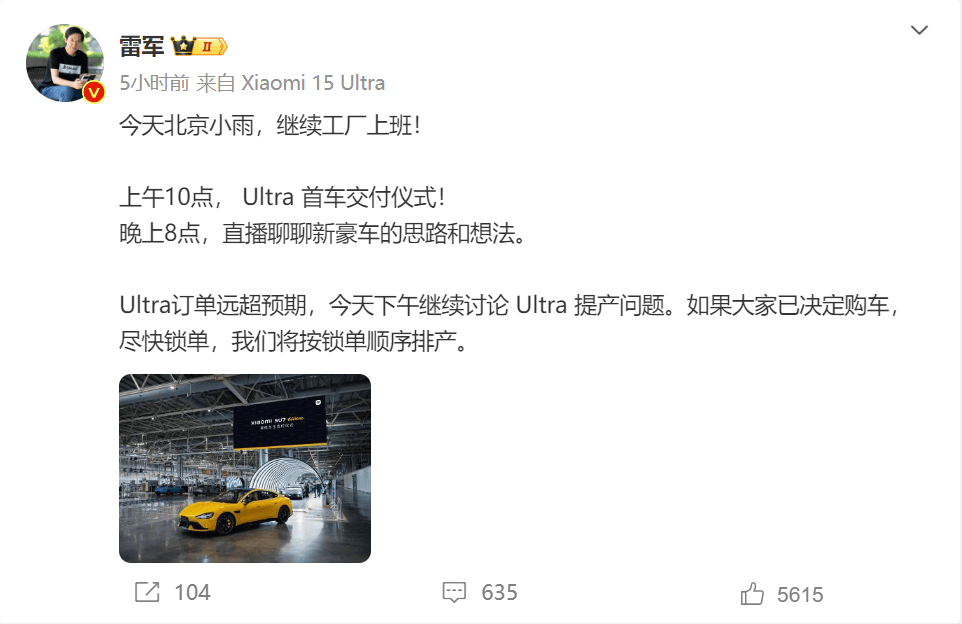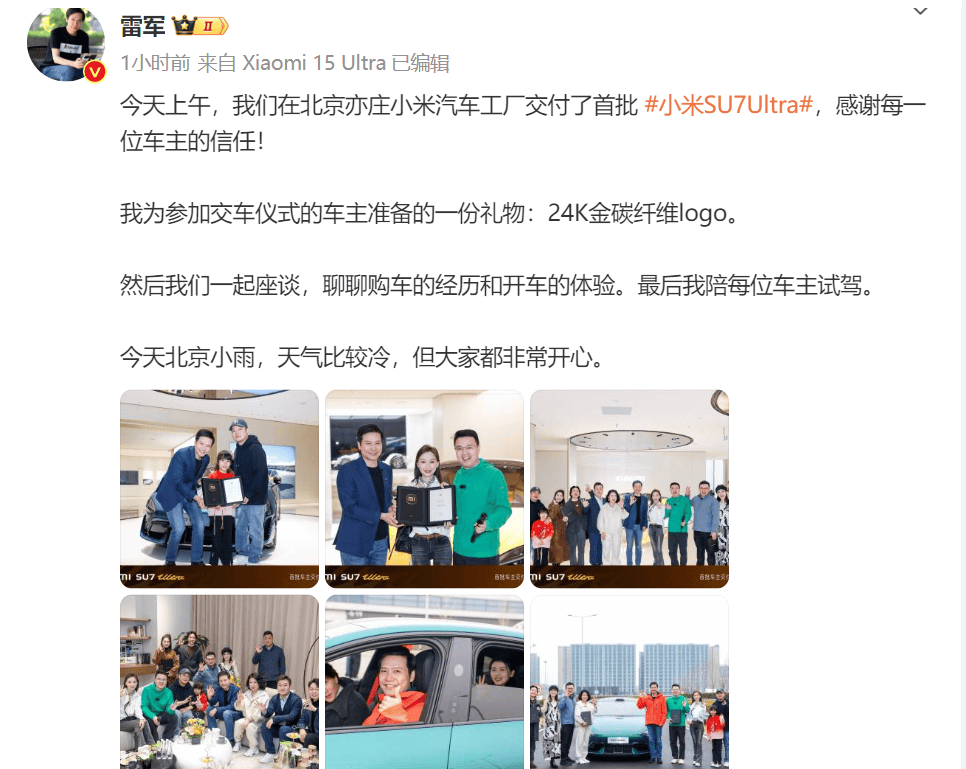 3月2日,小米创办人、董事长兼CEO雷军微博发文称,早上10点举行小米SU7 Ultra首车交付仪式。