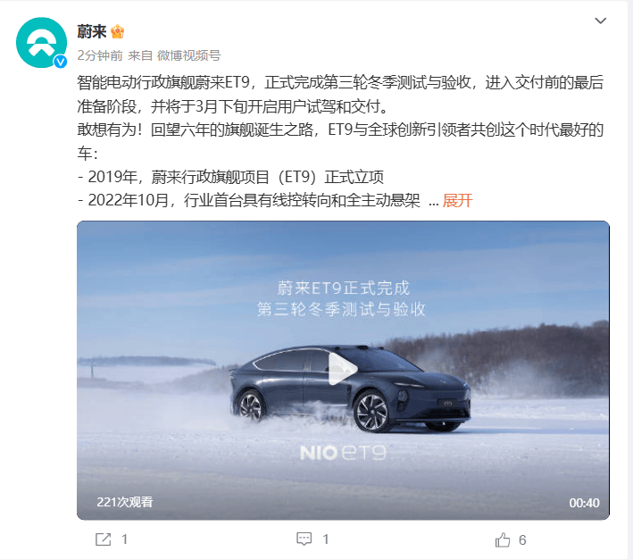 0每经AI快讯,3月3日,蔚来官方微博发文称智能电动行政旗舰蔚来ET9,正式完成第三轮冬季测试与验收,进入交付前的最后准备阶段,并将于3月下旬开启用户试驾和交付。每日经济新闻 ...