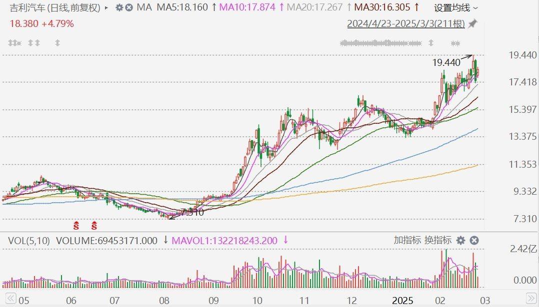 格隆汇3月3日|吉利汽车(0175.HK)盘中拉升涨5.7%,报18.54港元,截至目前成交超12亿港元。
