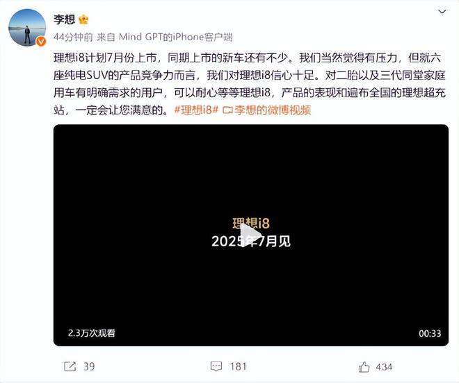 同辰科技讯 3月3日下午消息,今日上午,理想汽车宣布,理想旗下首款纯电SUV理想 i8将于今年7月发布上市。下午,理想汽车发文,针对销售时间、销售预期等网友关注的热门问题进行回答。