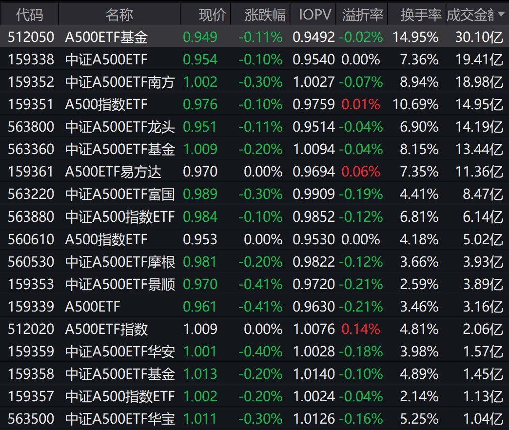 每经记者 叶峰 每经编辑 肖芮冬 市场早盘震荡调整,创业板指领跌。中证A500指数下跌0.21%,成分股中洪都航空涨停。 截至上午收盘,场内29只跟踪中证A500指数的ETF小幅下跌,其中有18只中证A500相关ETF成交额超1亿元,7只超10亿元,A500ETF基金早盘成交额超30亿元。 此外,有3只中证A500相关ETF换手率超10%,其中A500ETF基金早盘换手率达14.95%。 有券商表示,往后看,1、2月经济数据开始陆续披露,验证本轮逆周期发力成色,A股短期或延续结构性分化行情,但中期趋势仍具备向上动能。此外,两会的政策预期或能给予A股较好的支撑,像支持民营经济、民生消费和科技创新的政策,有望得到进一步部署,市场或呈现震荡偏强格局。 |