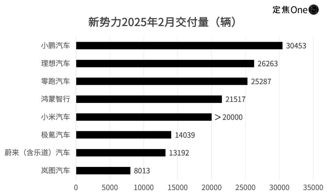 仍然是成绩好的先“交卷”。小鹏、理想、零跑和小米,都是当天上午晒出成绩单。 这回的冠军争夺战依然精彩:小鹏以30453辆的交付量排名第一,曾经的“三好学生”理想汽车交付26263辆,排在第二。两家的差距从上个月的423辆拉大到4000多辆。 另外两家进入2万辆俱乐部的选手也不简单:零跑闷声交付了25287辆,小米汽车虽然遮遮掩掩没报具体数,但也举着“超2万辆”的牌子挤进了前排。 剩下的新势力多数是拖到下午甚至晚上才悄悄交卷。 极氪、蔚来(合并乐道)分别交付14039辆、13192辆。鸿蒙智行全系交付21517辆,据36氪报道,问界交付11315辆。 以上7个品牌属于交付量过万的,剩下的2家,鸿蒙智行系的智界,以及岚图汽车,交付量分别是9580辆(据36氪报道)、8013辆。 上个月未公布交付量的智己也在3月1日披露了1-2月累计交付7037辆。根据中汽数研,智己2月交付4237辆。 除了个别选手,大部分企业2月的销量都是下滑的。作为开年第一个淡季,这种销量波动其实早有预兆――首先,春节长假直接压缩了车企的实际生产和交车周期,能干活的时间比平时少了将近一周;其次,消费者年前扎堆买车回家过年,1月的需求被提前消耗,导致春节后的2月出现销量“空窗期”。 不过,我们依然可以从中观察新势力节后的“恢复能力”。这种藏在数据里的“反弹力”,才是洞察车企真实战斗力的关键所在。到底谁在偷偷发力?谁又露了怯?本文将重点对6个新势力品牌(小鹏、理想、零跑、小米、问界、蔚来)进行分析。 尖子生:小鹏超理想,不同赛道的竞争 先看新势力中的前两名,小鹏和理想。 小鹏风头正盛,2月交付30453辆,再次超过理想,坐上新势力头把交椅。上个月两家的交付量都在3万以上,这个月转眼就变成了小鹏的独角戏。 上个月,小鹏仅比理想多交付了423辆,算是“产能效率”的小胜:小鹏提前优化供应链,如电池采购协议,抢在春节假期前产能冲刺。而理想2024年底为了冲销量延长免息政策,导致部分需求提前释放,1月订单储备不足。 到了2月,小鹏的领先差距拉大到四千多辆,关注新能源汽车市场的投资人李运评价,“归因于产品定义、营销、渠道优化”。 小鹏虽然在2月推出了行业独一份的“五年0利息0首付”购车政策,相当于车价最高能隐性优惠5.7万元,但贡献销量的两款车MONA M03(10万元级)和P7+(18万元级),并非单纯靠降价,而是靠产品定义。 李运补充道,小鹏过去也推出过低价车型,例如G3、P5,但表现并不理想。
