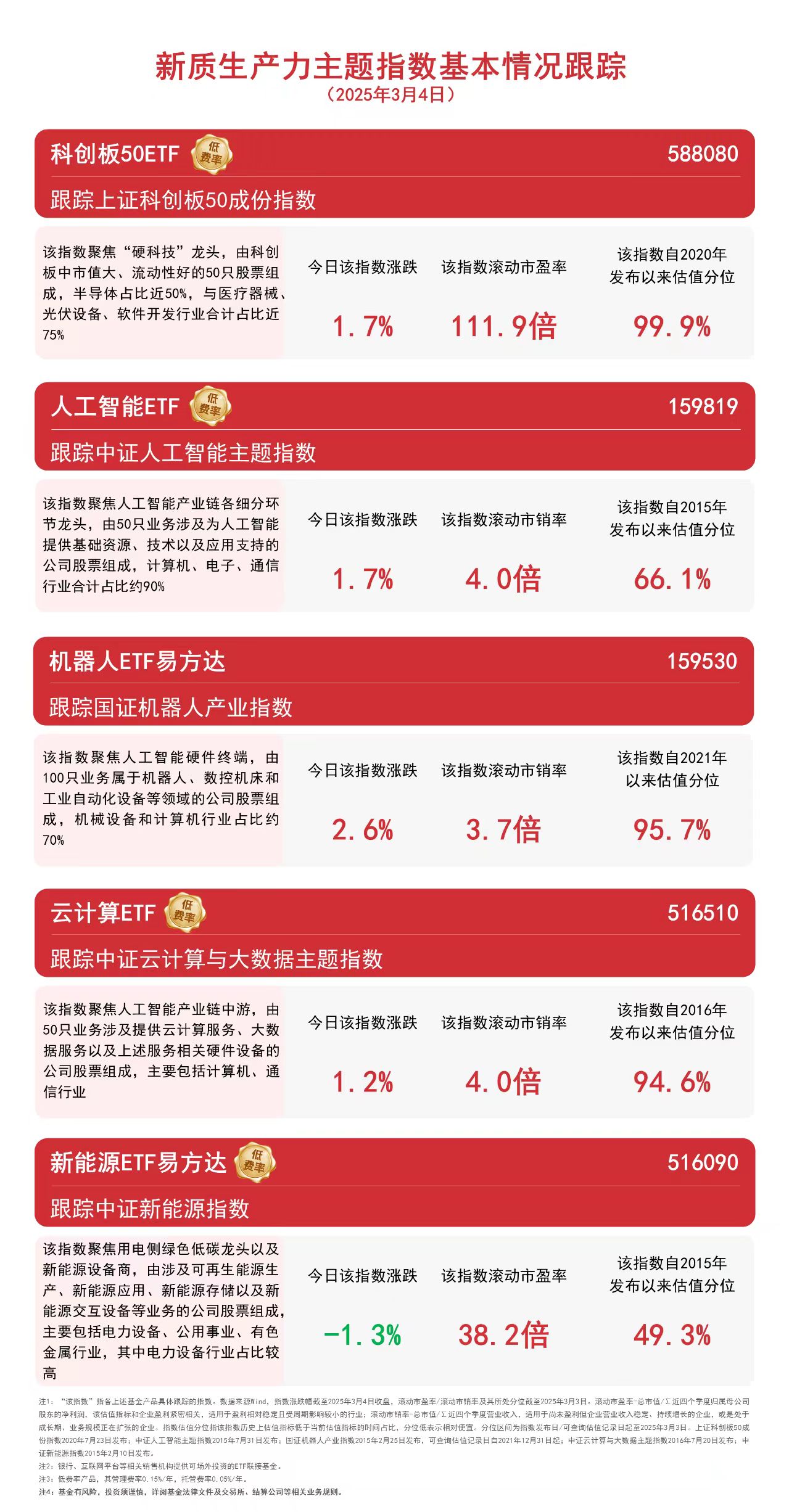 今日,机器人、算力、软件开发等热门题材集体走强。截至收盘,国证机器人产业指数上涨2.6%,中证人工智能主题指数、上证科创板50成份指数均上涨1.7%,中证云计算与大数据主题指数上涨1.2%,中证新能源指数下跌1.3%。 ...